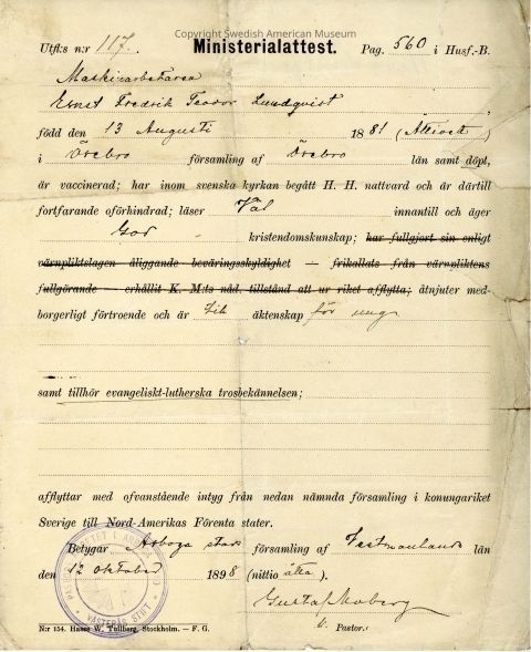 Certificate from Gethsemane Church, 1898.Context