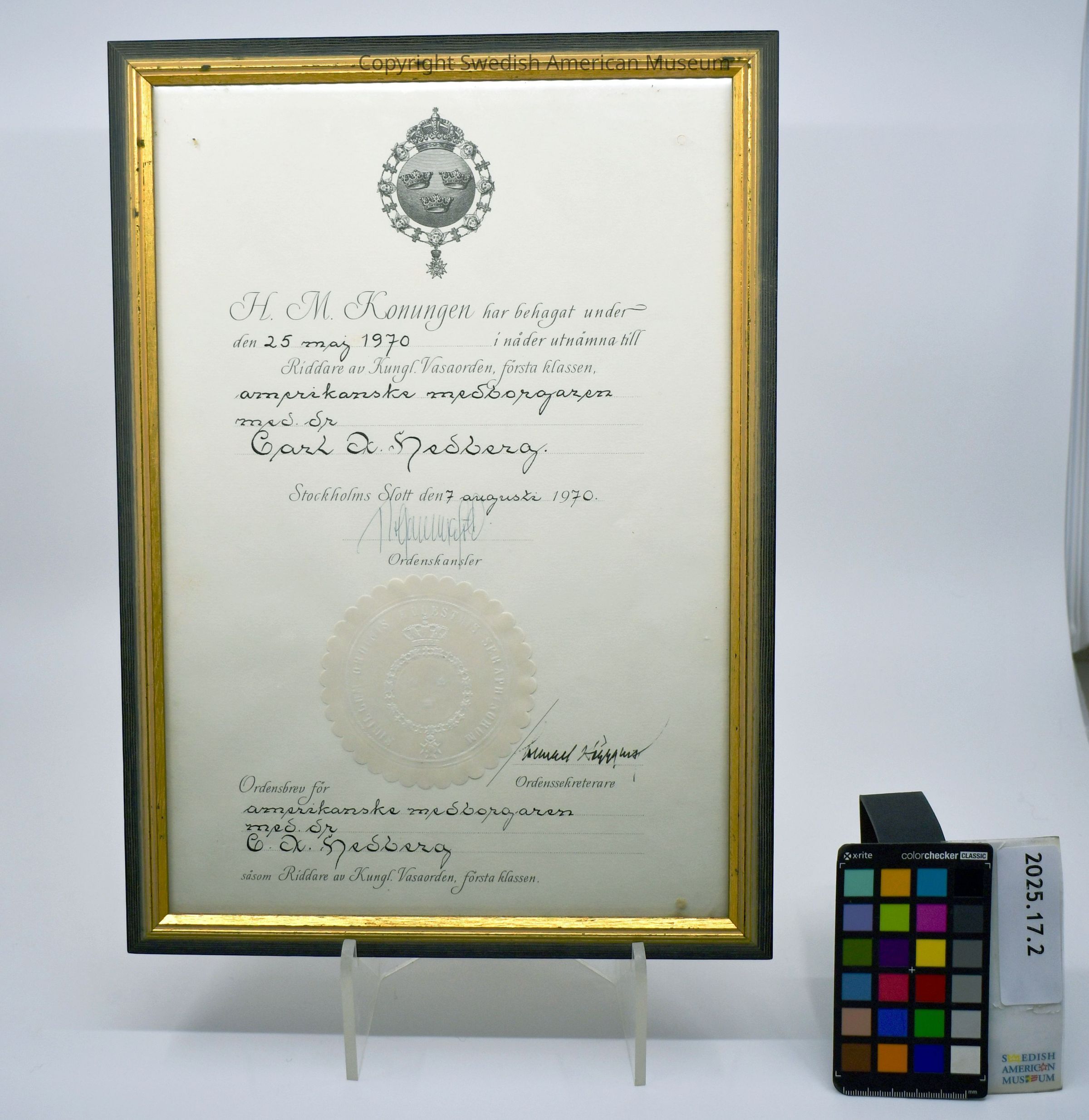 Framed Order of Vasa certificate awarded to Charles "Carl" Hedberg on May 25th, 1970.Context