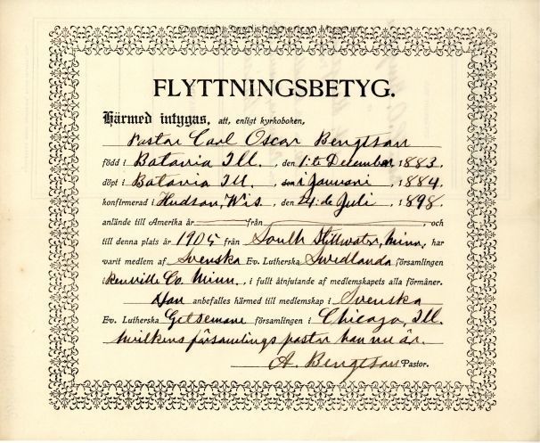 Certificate from Gethsemane Church, 1905.Context