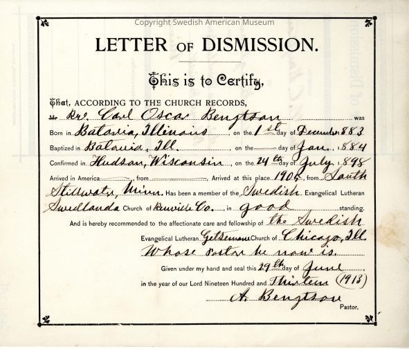 Certificate from Swedish Evangelical Lutheran Swedlauda(?) Church, 1913.Context