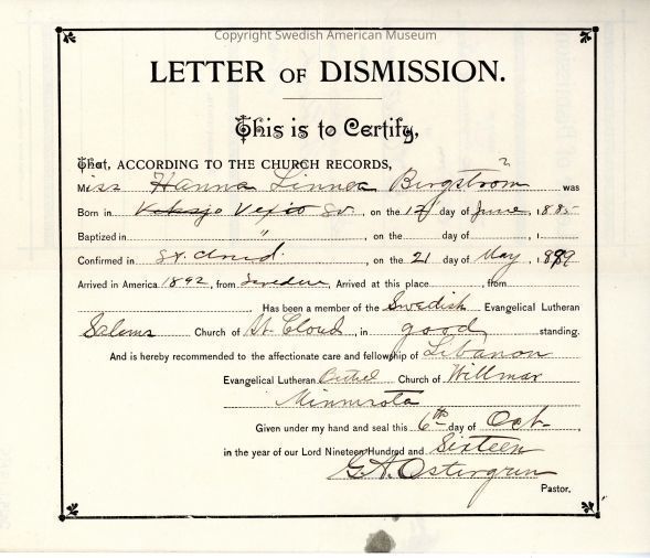 Certificate from Gethsemane Evangelical Lutheran Church, 1916.Context