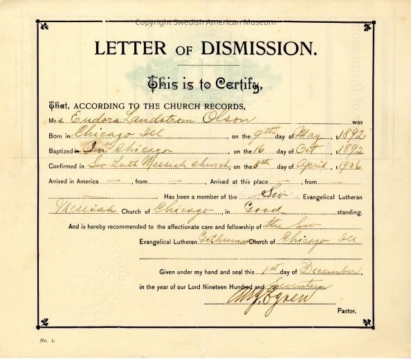 Certificate from Gethsemane Evangelical Lutheran Church.Context