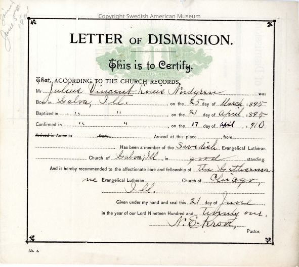 Associated with Julius Vincent Louis Nordgren.Acquisition