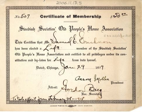 Certificate of Membership to Swedish Societies' Old People's Home Association January 29, 1919.Acquisition