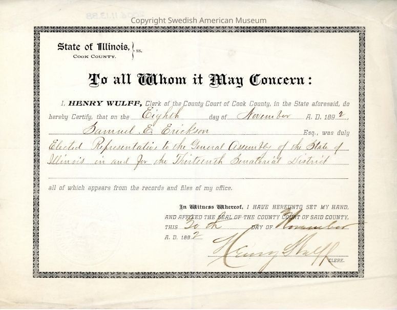 Certificate to show Sam Erickson elected as Thirteenth District of the State Assembly November 8, 1892.Acquisition