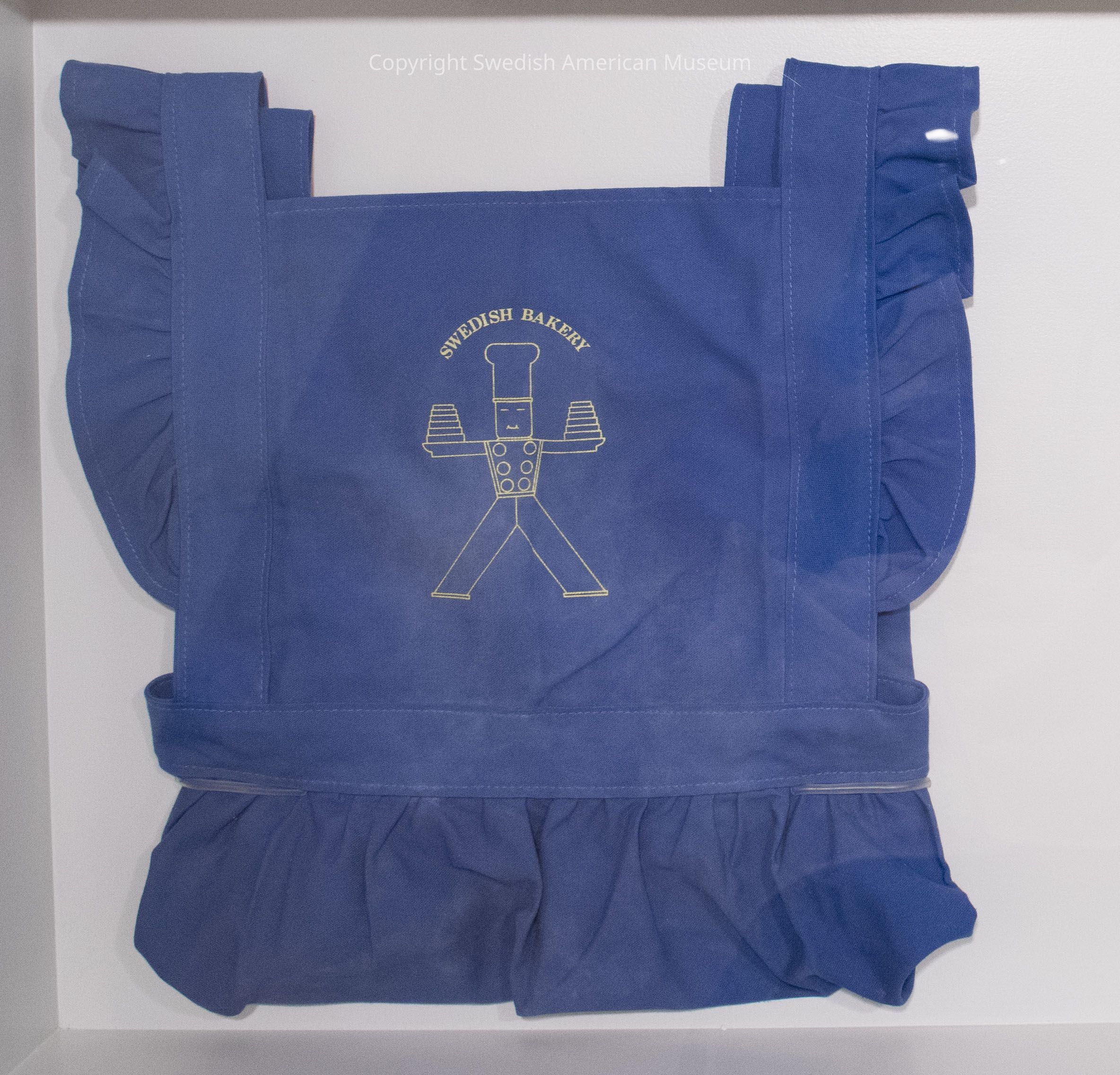 Blue apron with two straps. The front of the apron has a yellow and blue sketching of a man and the inscription, "Swedish Bakery" written in yellow letters.Context