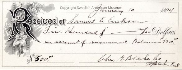 Check for 500 dollars made out to Samuel Erickson, January 10, 1924.Acquisition