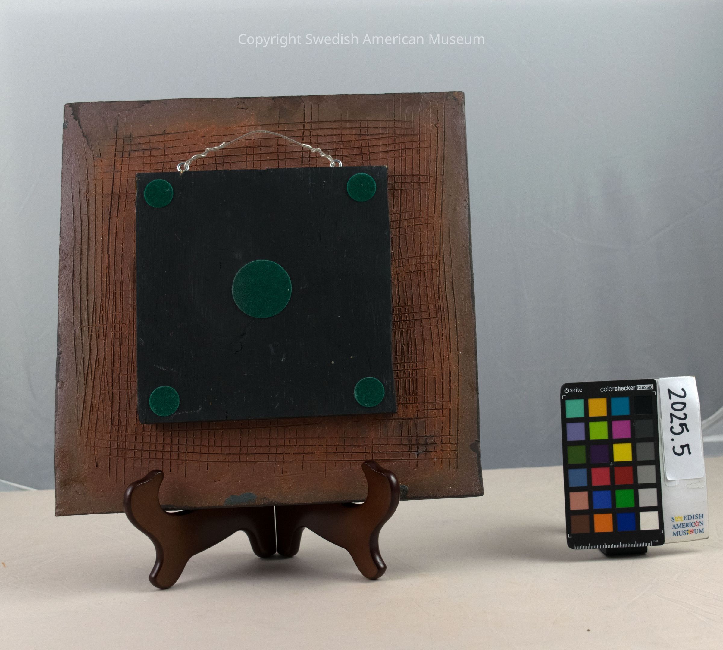 Clay tile created by Swedish-American artist Corinne Peterson, with muted colors and abstract shapes carved onto the surface.Context