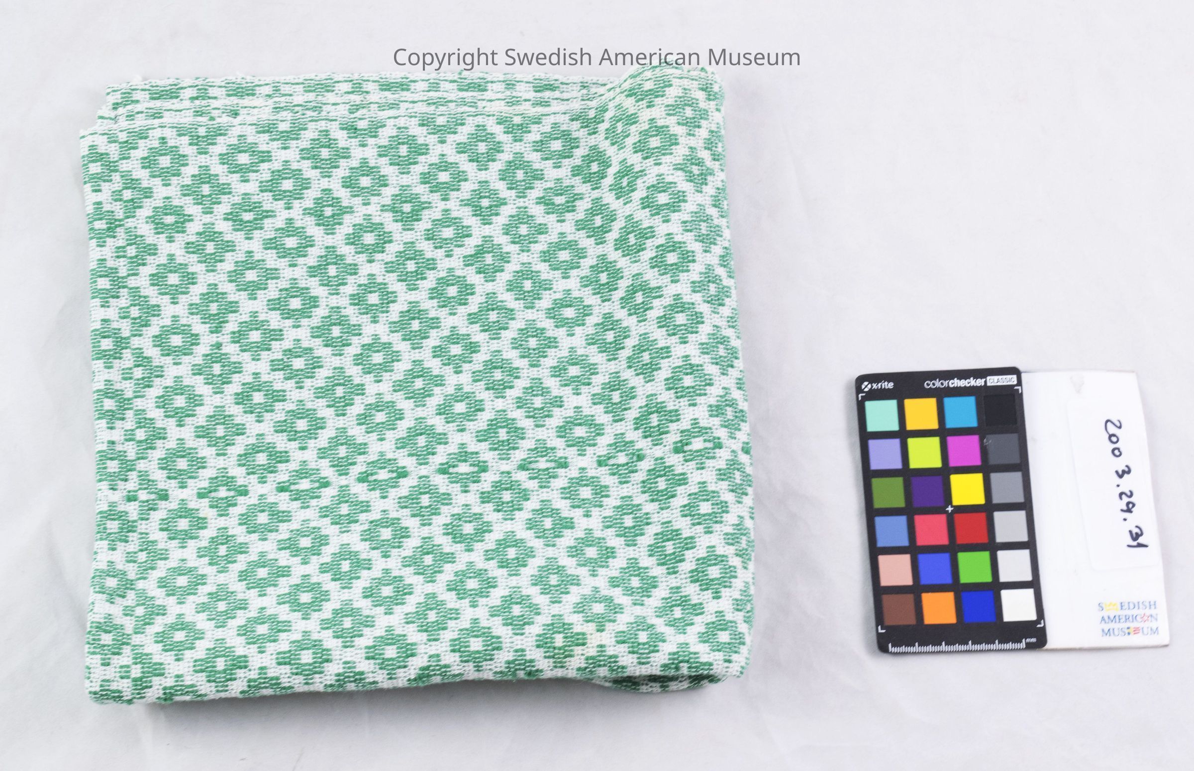 Hand-hemmed tablecloth that can be used as a small tablecloth or napkin. Green and white woven pattern.