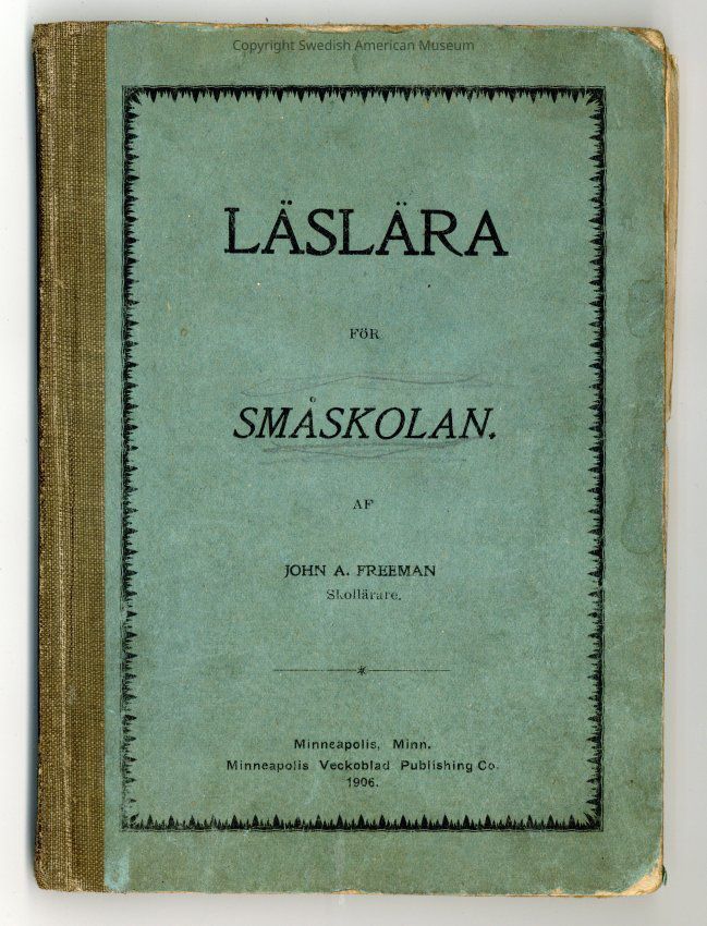 Reader titled "Läslära" by teacher John A. Freeman. Used to teach children how to read in Swedish "småskolan" (Lit.: small school). Published in Minneapolis, Minnesota in 1906.