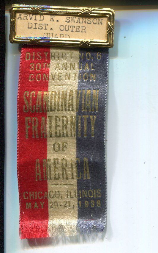 Scandinavian Fraternity of America ribbon for Arvid E. Swanson, District Outer Guard, 30th Annual - May 20 & 21, 1938, Chicago, Illinois.Acquisition