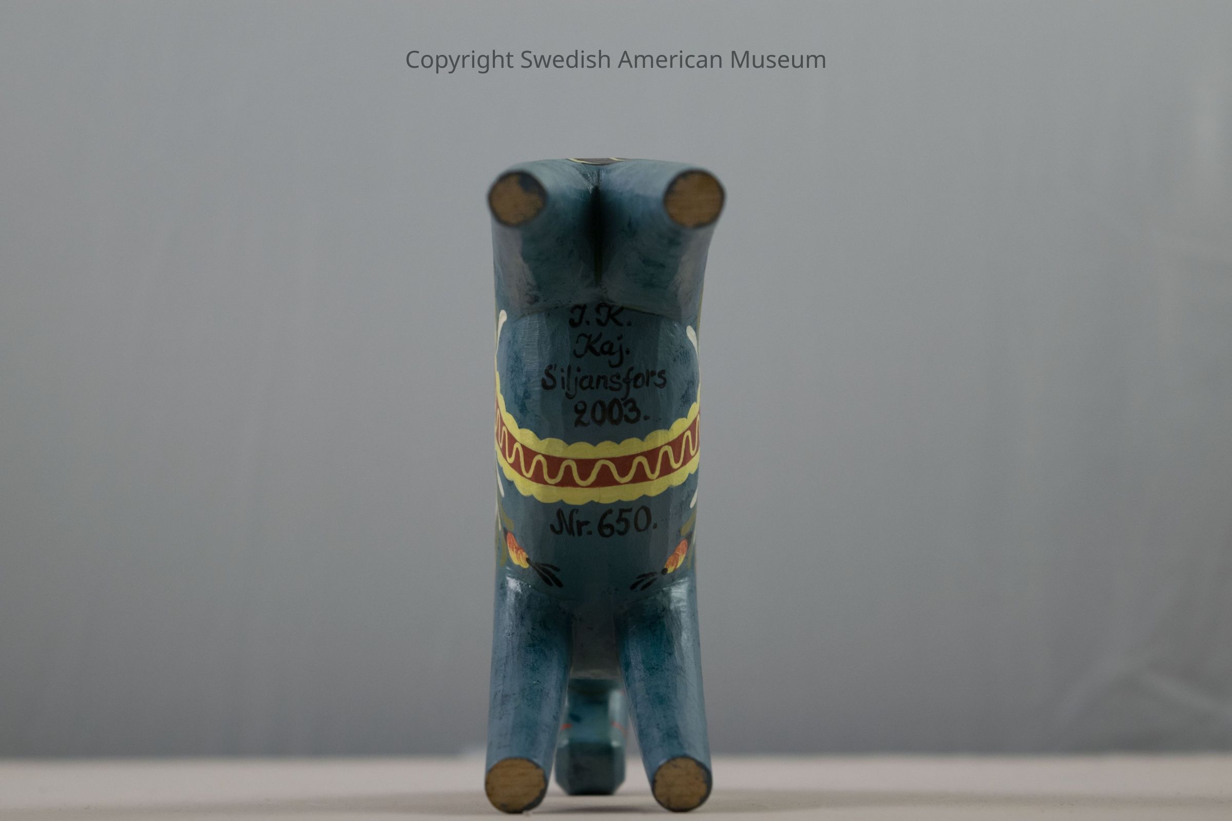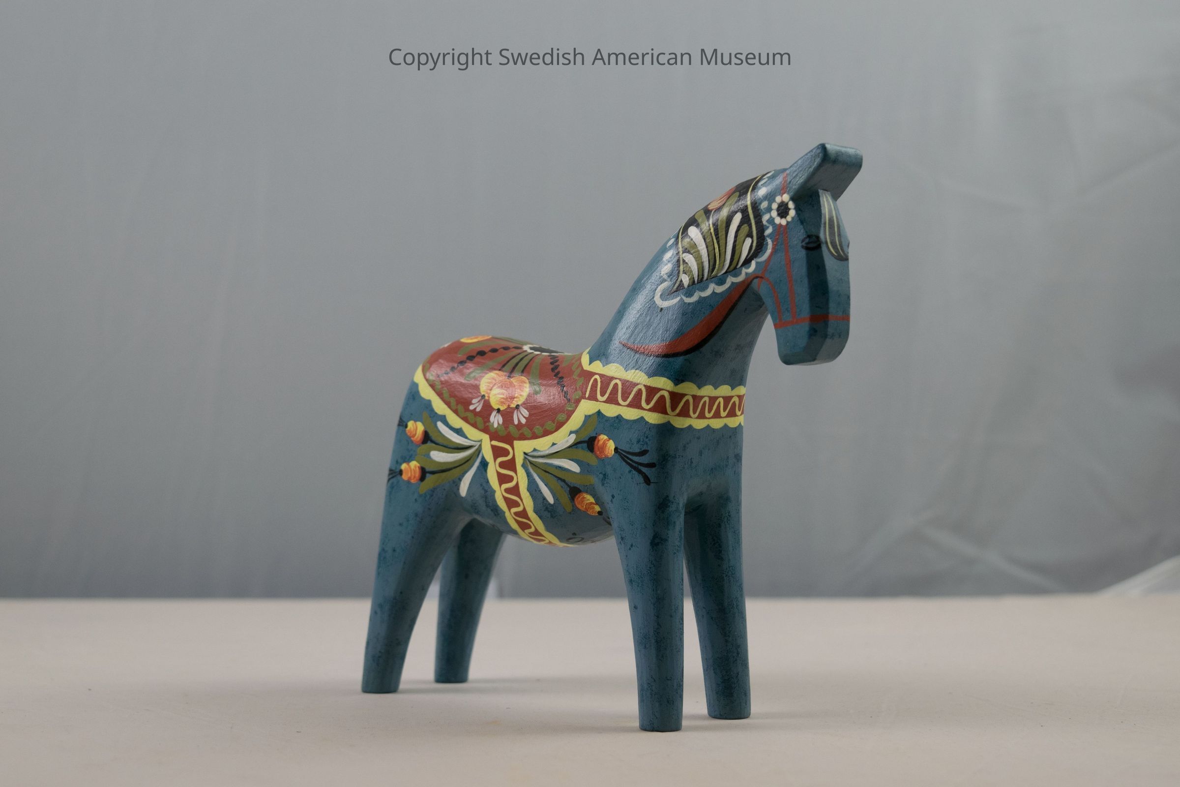 This horse was carved by Ingvar Kusagård and painted by artist Anna-Karin "Kaj" Hansson. Hansson started creating Dala Horses from a young age and gained experience under the tutelage of John Gudmans. She has been painting these horses her whole life and continues to do so despite her issues with arthritis. She is credited with creating the Siljansfors Horse, which has a larger saddle and more elaborate floral decoration. Hansson's horses are featured in several museums in Sweden and King Carl Gustaf and Queen Silvia of Sweden may even have one featured on their mantelpiece, as Hansson gifted one to them.