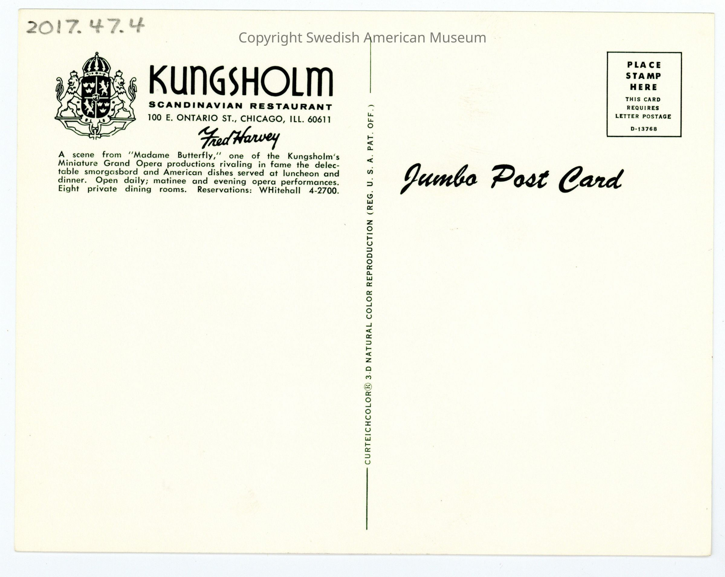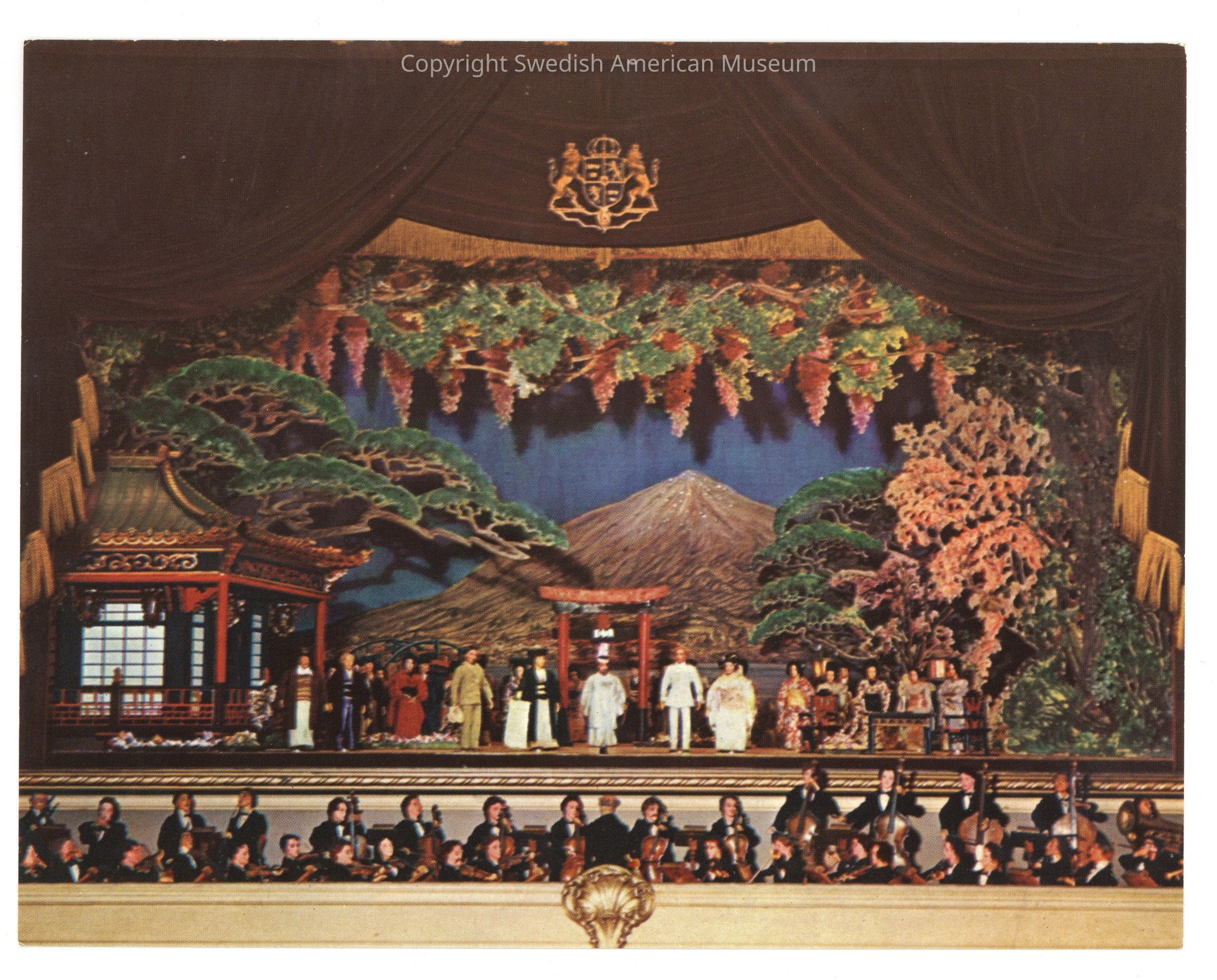 Postcard of the Kungsholm Scandinavian Restaurant at 100 E. Ontario St.-Chicago, Il. 60611. Depicts a full view of the stage and orchestra during a scene from the production, "Madam Butterfly." The restaurant's productions of "Madame Butterfly" and other operas were almost as famous as the restaurant's delectable smörgåsbord and American dishes served during lunch and dinner hours.Context