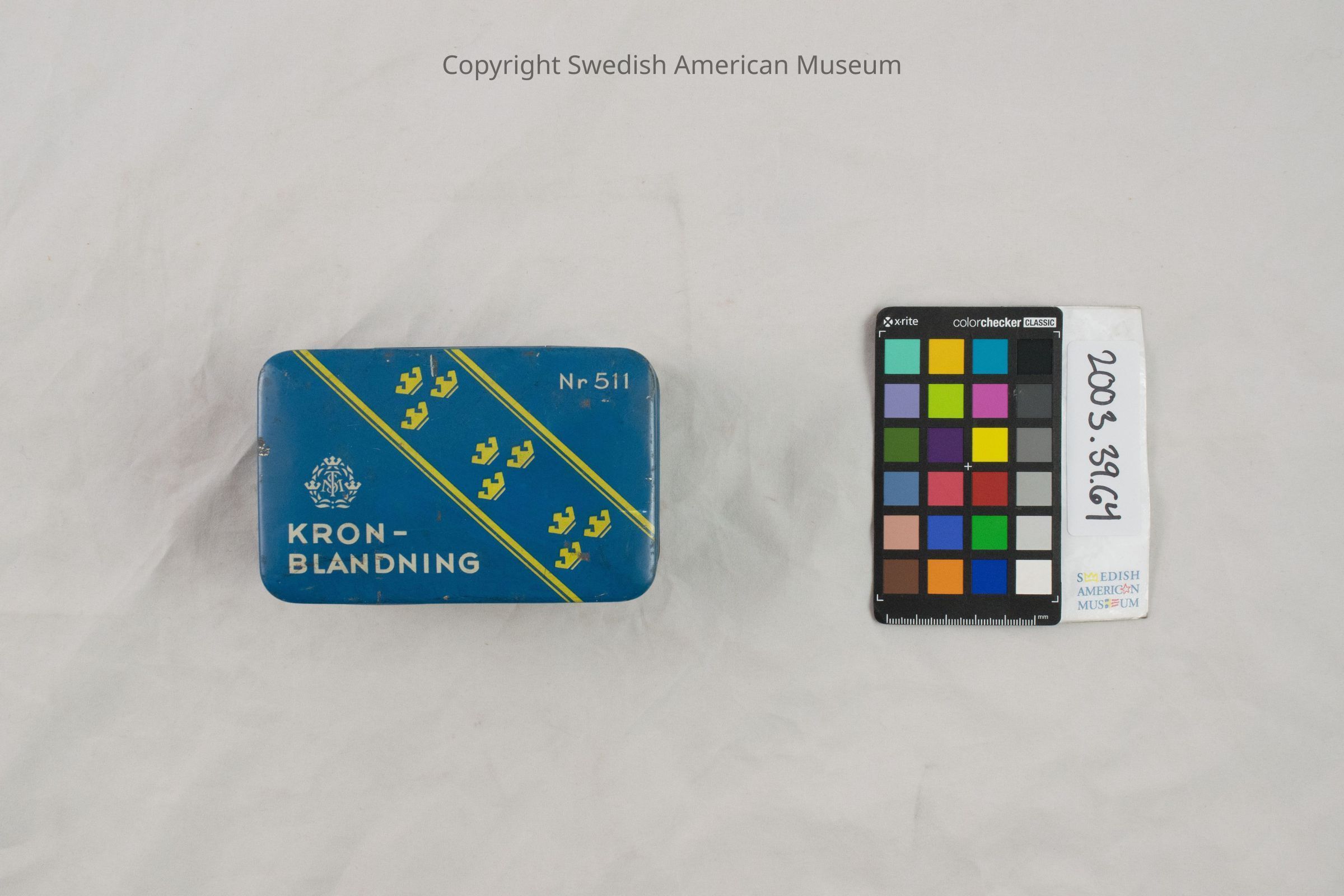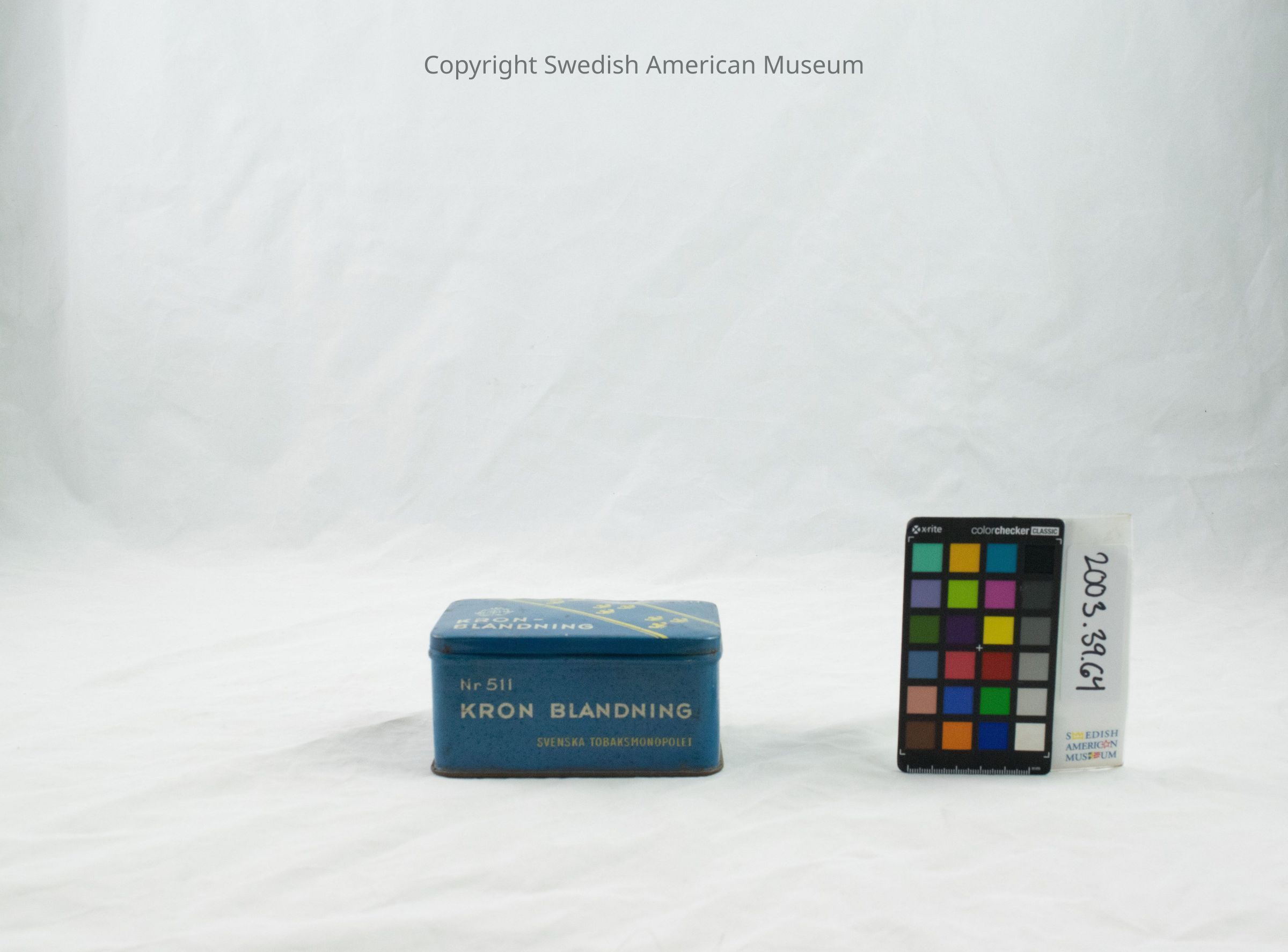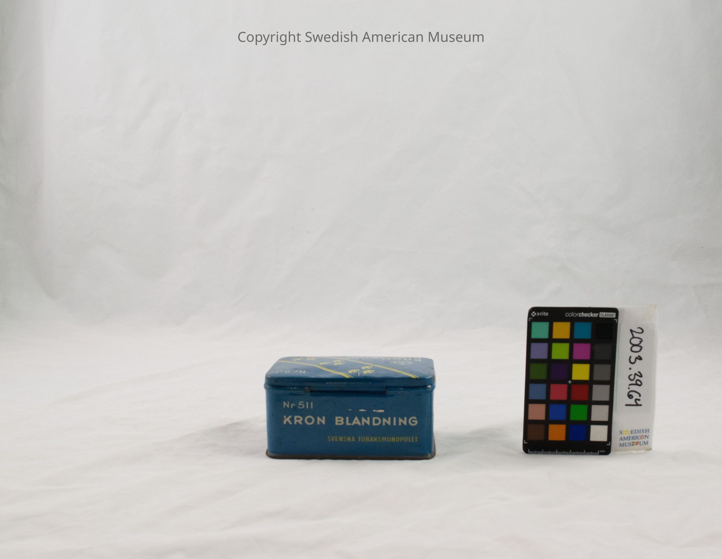 Blue tobacco box for Swedish snuff made of sheet metal. It has yellow crown shapes and the inscriptions, "Kron Blandning" and "Svenska Tobaksmonopolet."
