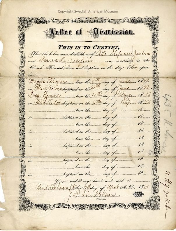 Letter of dismission from Gethsemane Church, 1894.