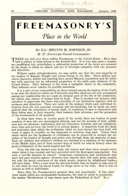Page tore from the Chicago Scottish Rite Magazine on Freemasonry, January 1939 with Samuel E. Erickson Obituary.Acquisition