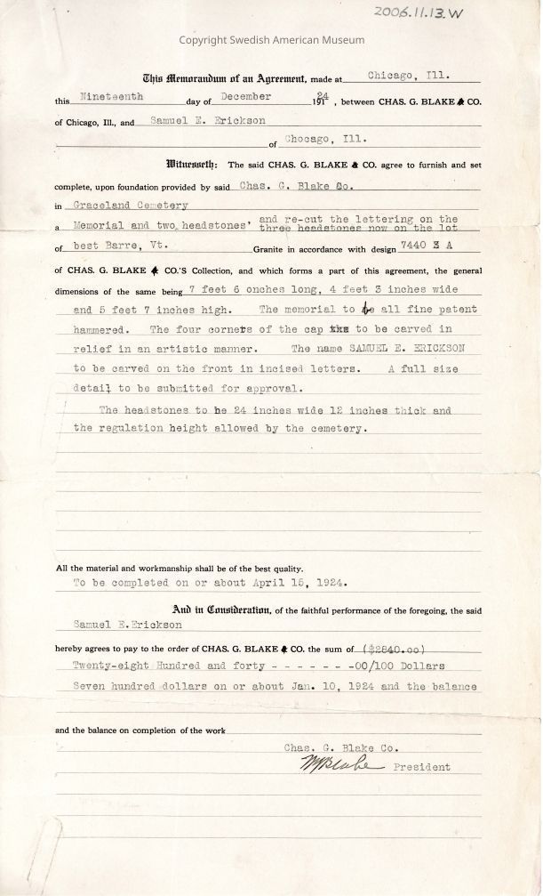 Form for Samuel Erickson's Headstone December 19, 1924.Acquisition