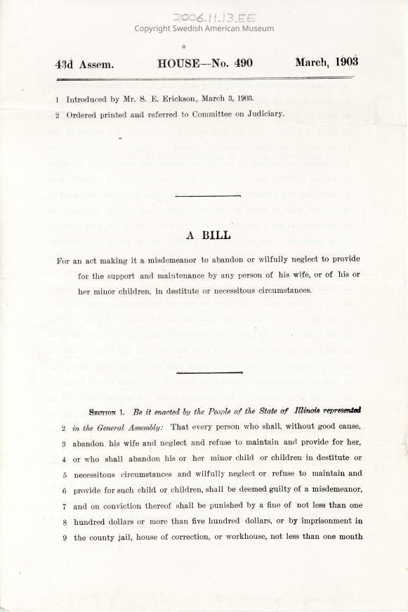 House Bill No 490 presented by Sam Erickson, March 1903.Acquisition