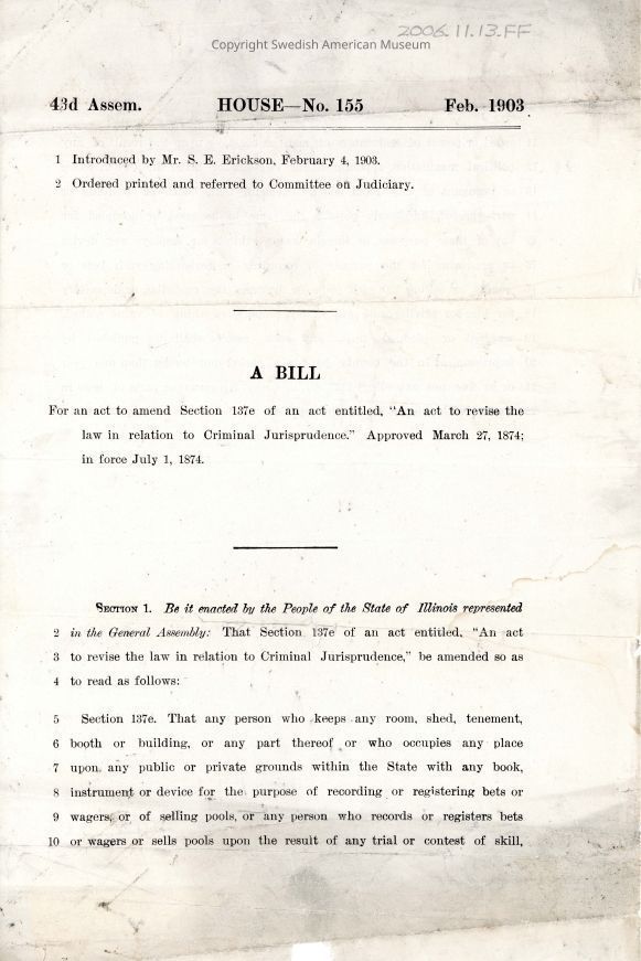 House Bill No 155 presented by Sam Erickson, February 1903.Acquisition