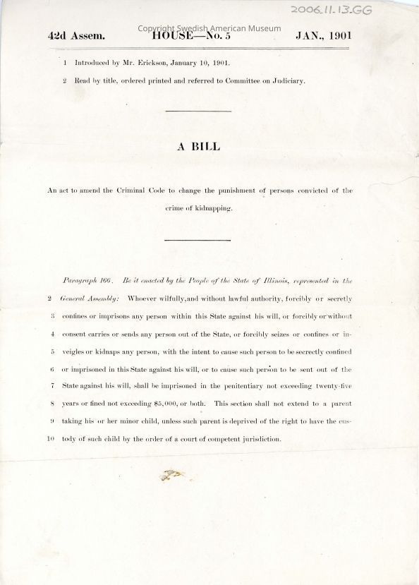 House Bill No 5 presented by Sam Erickson, January 1901.Acquisition