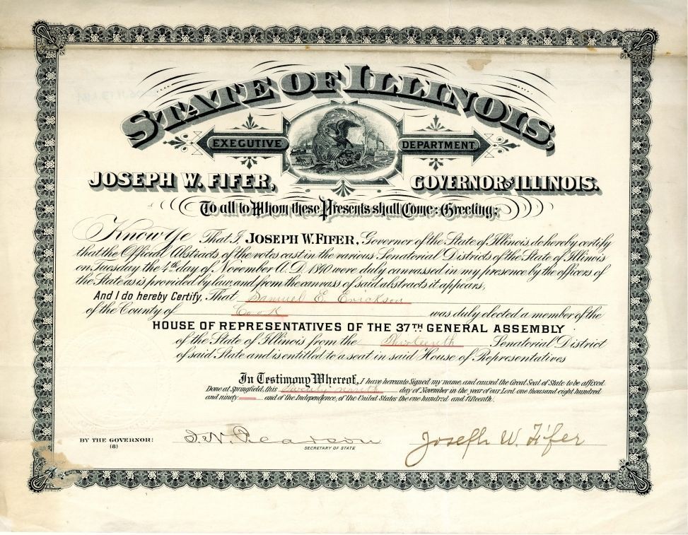 Certificate to award Samuel Erickson to the State Assembly November 29, 1890.Acquisition