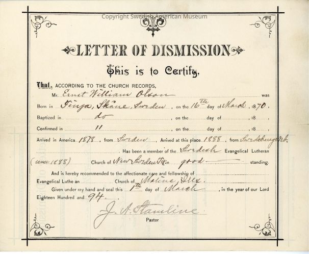 Letter of dismission from Gethsemane Church, 1894.Context