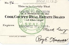 Membership card from Cook County Real Estate Board December 31, 1919.Acquisition