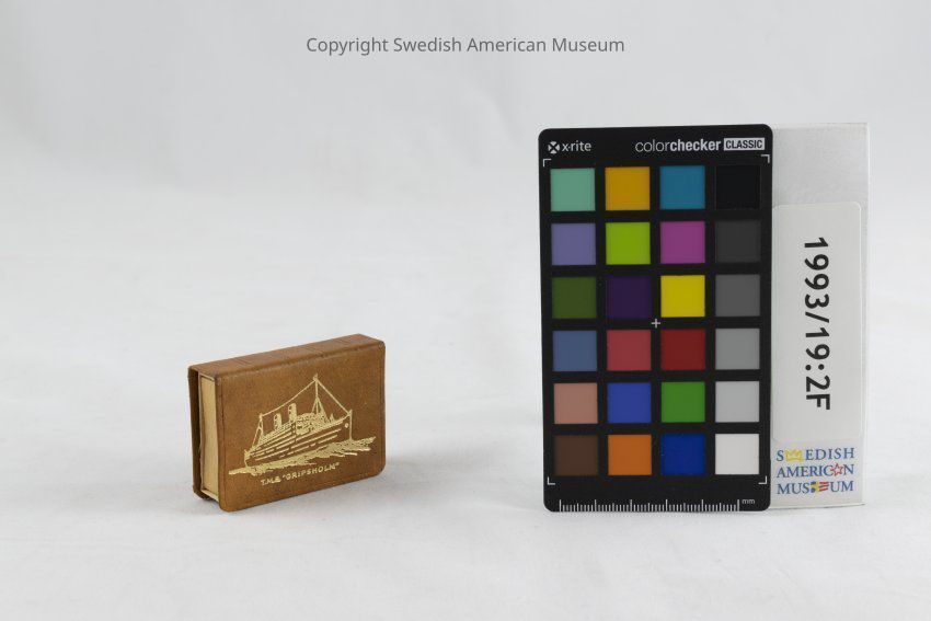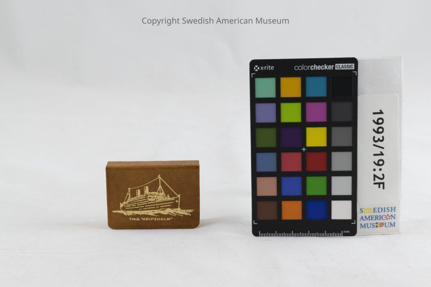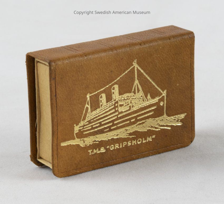 Metal matchbook holder from the Swedish American Line with T.M.S. Gripsholm on the cover.Context