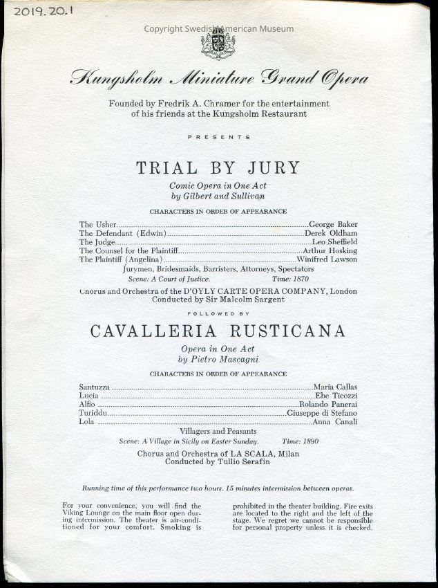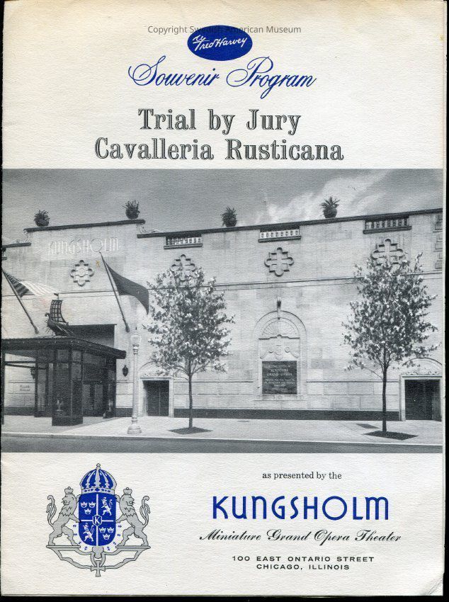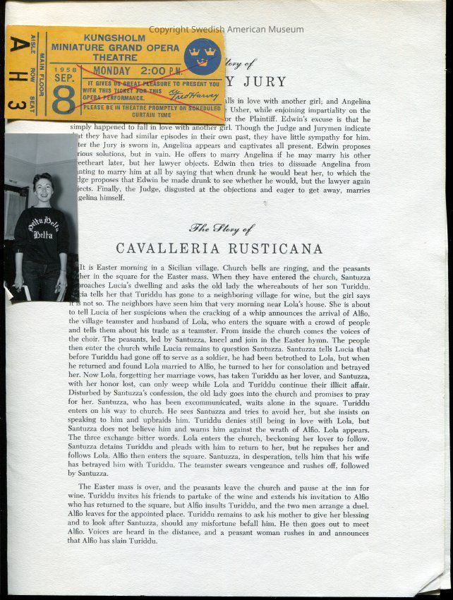 Souvenir program for "Trial by Jury" and "Cavalleria Rusticana" at the Kungsholm Miniature Grand Opera Theater on Chicago's Near North Side on Mon. Sept. 8, 1958, at 2:00 P.M. A ticket and a photograph of a woman wearing a Tri-Delta Sorority Sweatshirt are pasted into the centerfold of the program. The front of the program is decorated with a picture of the Kungsholm Restaurant and Theater.Context
