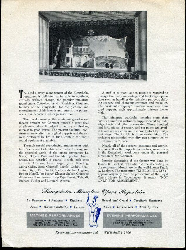 Danish-born immigrant Fredrik Chramer remodeled the McCormick Mansion in 1937 into a Swedish style restaurant with multiple dining rooms in blue, gold and pink. The restaurant included private dining rooms and buffet style food such as smörgåsbord. Inspired by puppet shows from his childhood, Chramer opened the Kungsholm Miniature Grand Opera Theater together with the “father” of the puppet-opera Ernest Wolff in 1940, in an adjoining building to the restaurant. The restaurant and theater were operated in conjunction by Chramer.
