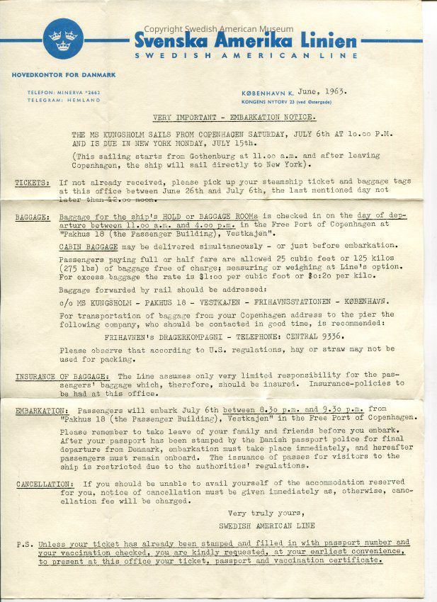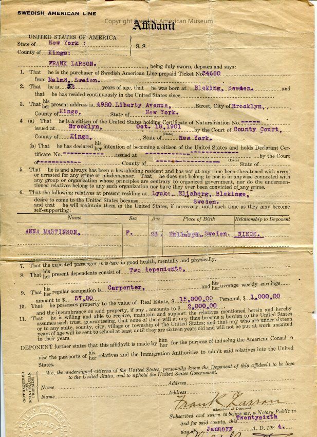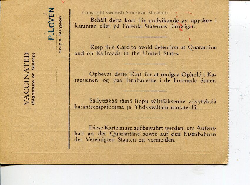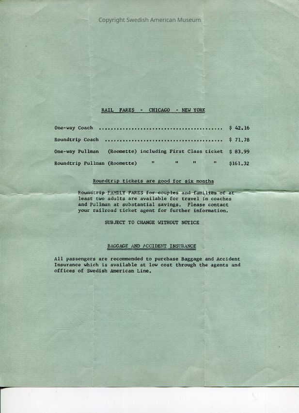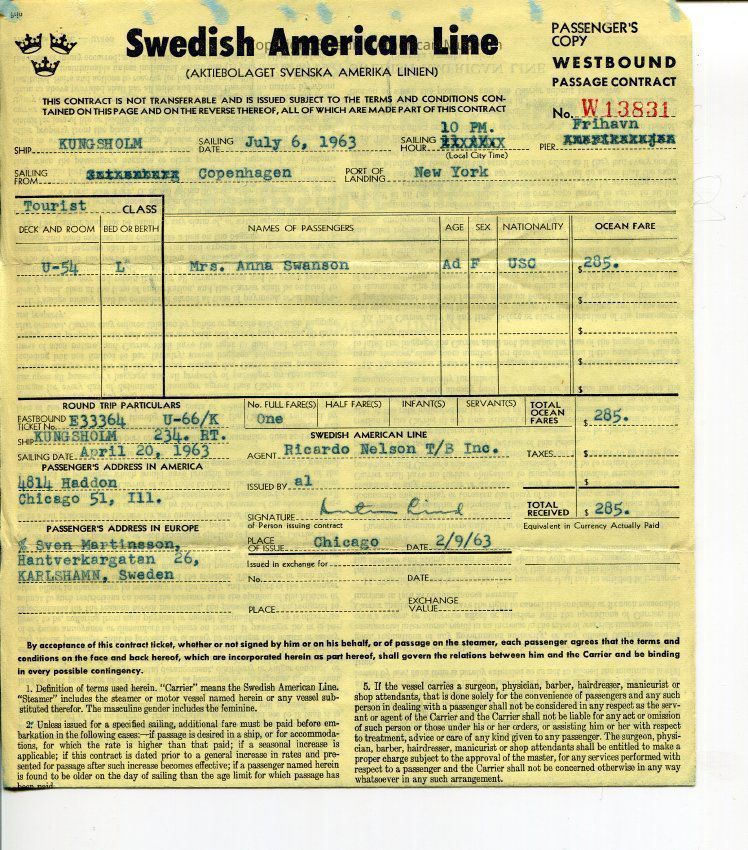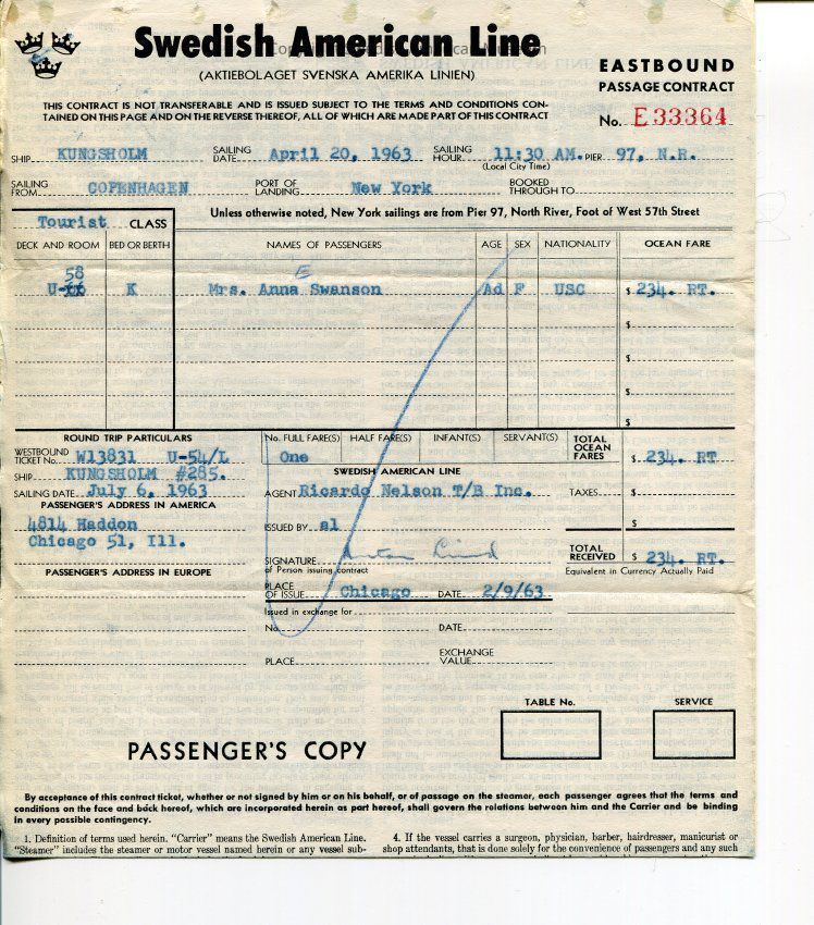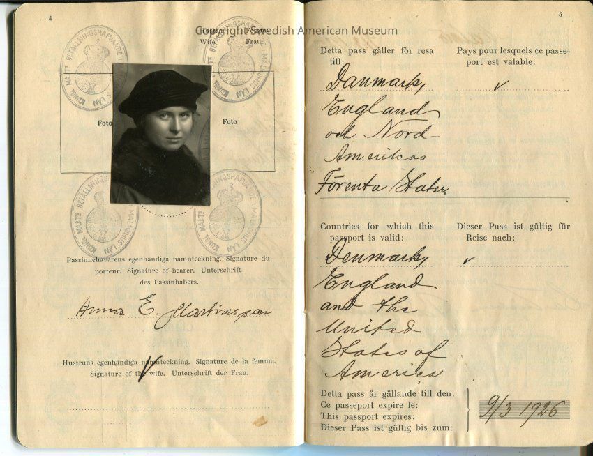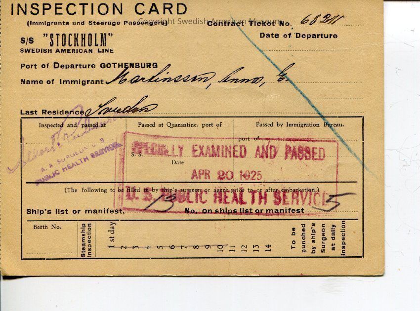 This folder contains travel and immigration records of Anna Louise Swanson and her parents Anna Elisabet Martinsson and Karl Gustaf Ragnar Svenssion between Sweden and United States. Dated 1924-1992.Title