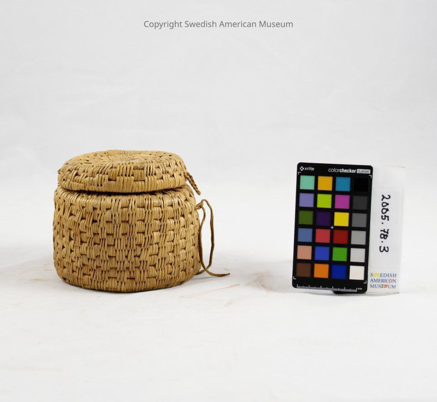 Tan woven basket made of birch roots, made by an unknown Sámi artisan.