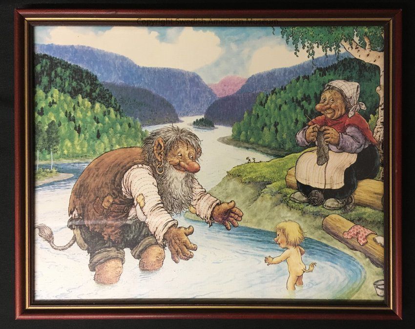 Framed print with an original drawing by the artist, Rolf Lidberg, on the back. Three troll-like figures, one of whom is a man wearing a white shirt, gray and black short pants, and a brown jacket, a woman wearing a purple blouse, a red shawl, a pine green skirt, a white apron with thin yellow vertical stripes, a white headscarf, and whiteish-gray shoes, and a blond child troll. The man and the child are in a winding blue and white river with an area of green bushes. The man appears to be ready to pick up the child while the woman is sitting on a log on the shoreline, knitting a gray scarf. In the distance is a blue sky with clouds. The back of the print shows a drawing by the artist, Rolf Lidberg. It consists of a black and beige sketching of a large troll-like figure of a man and a large bush, an inscription that reads "Greetings from Rolf Lidberg", and an inscription that reads "R-87." Wooden frame in reddish-brown color with an inner section of copperish gold-colored metal.Context