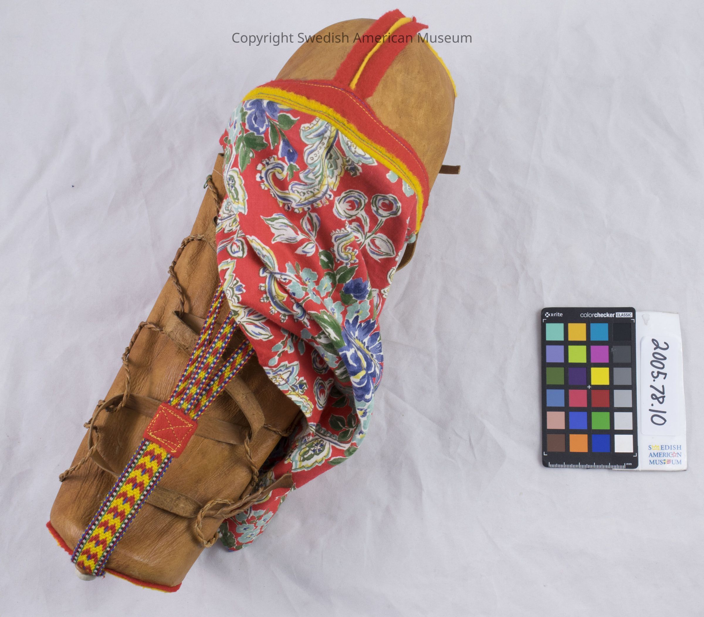 A Sámi cradleboard made of reindeer leather, with red and yellow felt. A woven band and a piece of woven cotton is used to shield the child from the sun and wind.Context