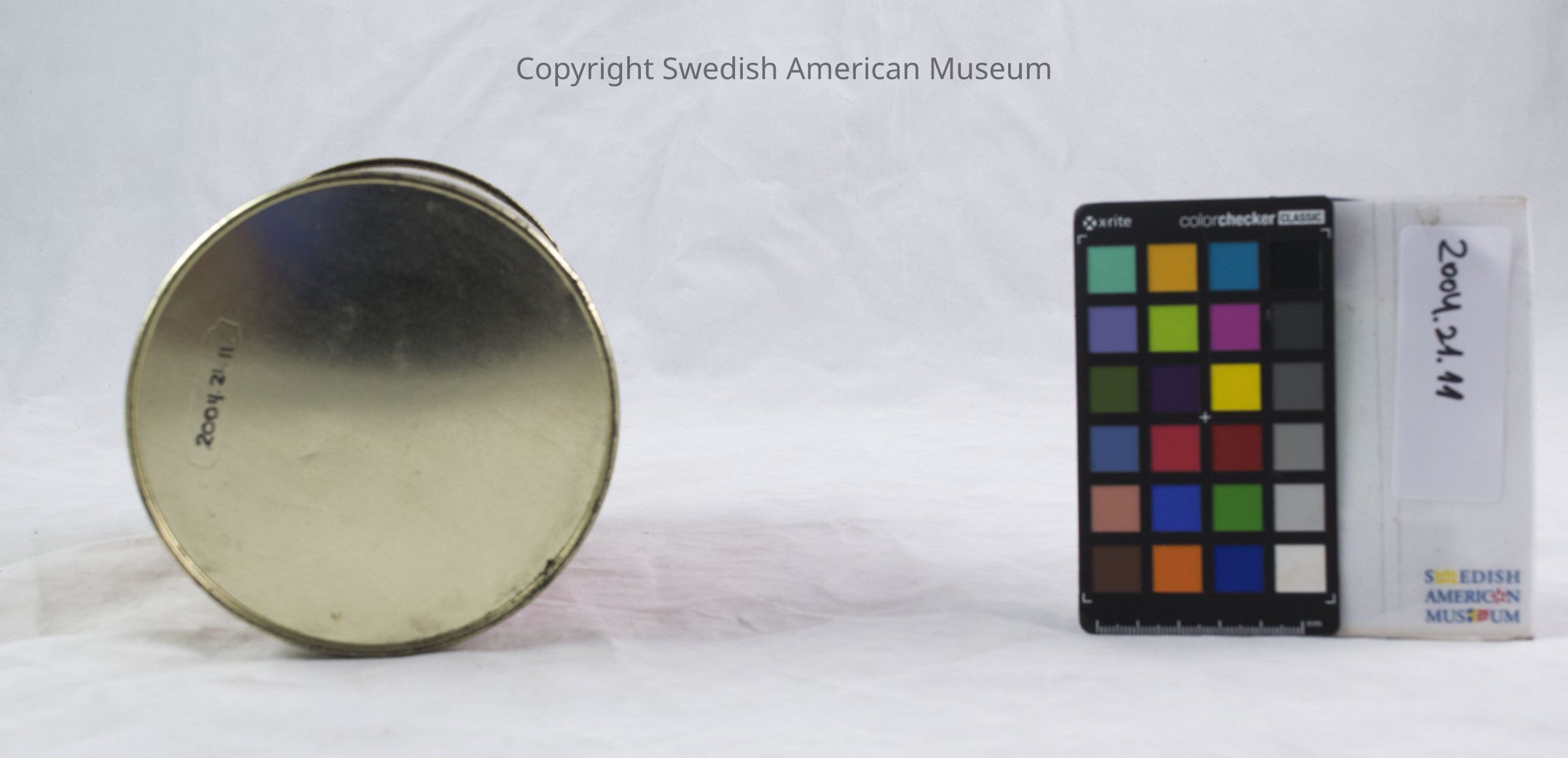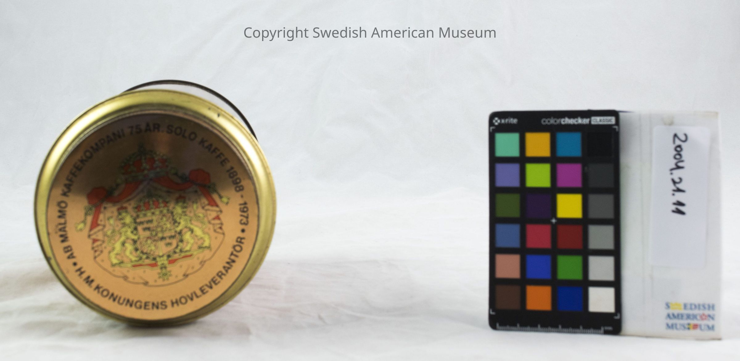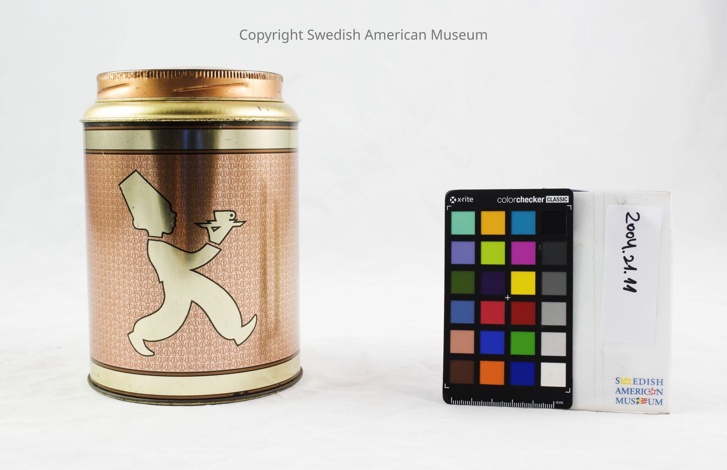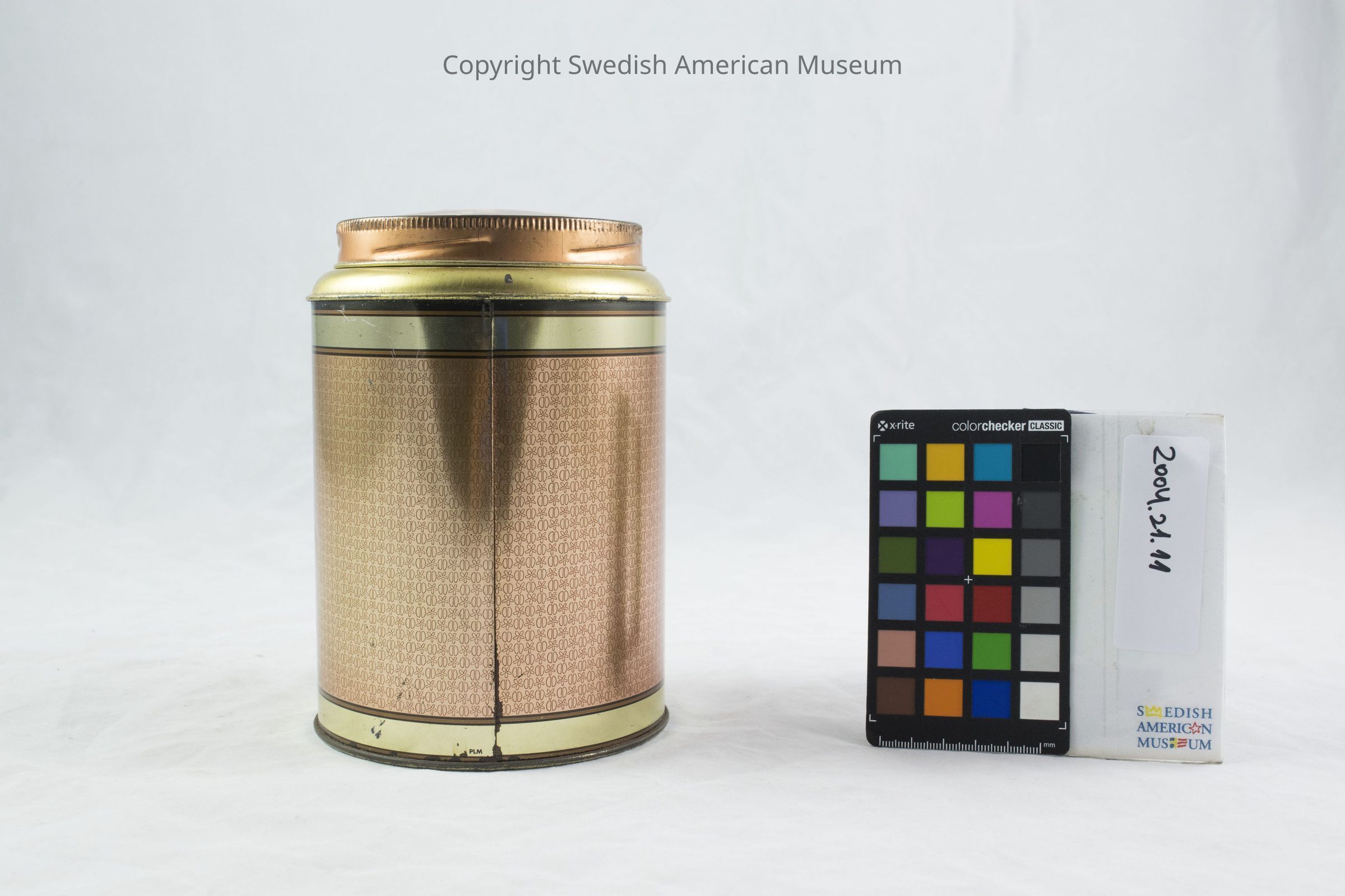 Tin coffee container that has a copper-colored exterior and gold-colored interior. The exterior also has two gold-colored horizontal rings. The container has a copper-colored lid with a golden ring and at the top of the lid, there's a copper-colored shield shape with black outlines which has two golden crowns and two golden animal shapes.Acquisition