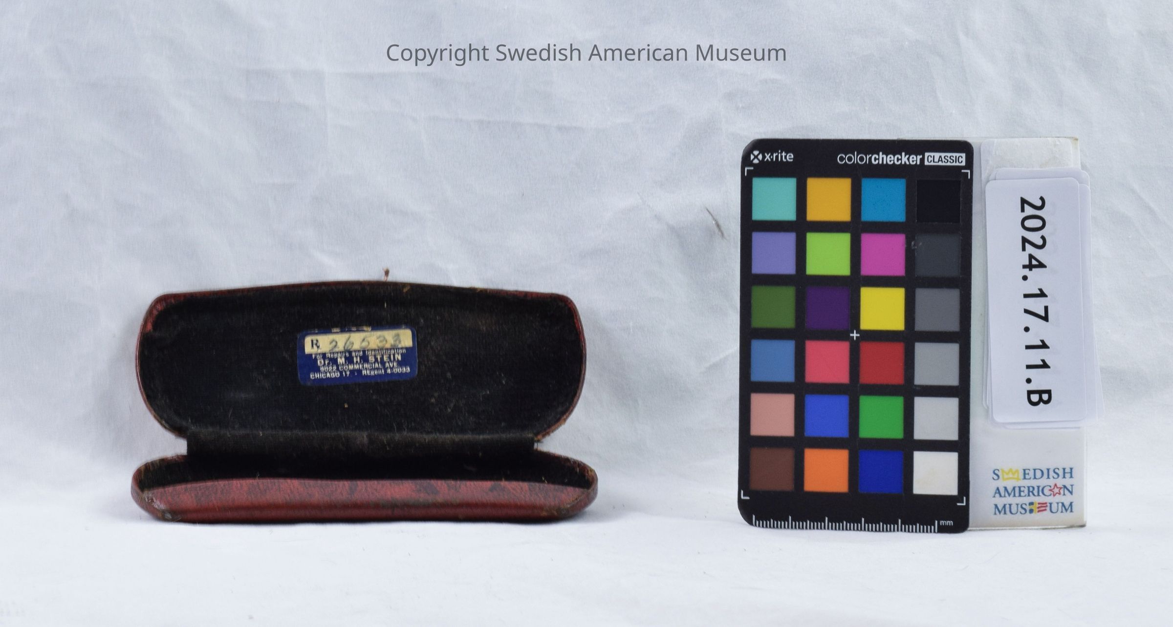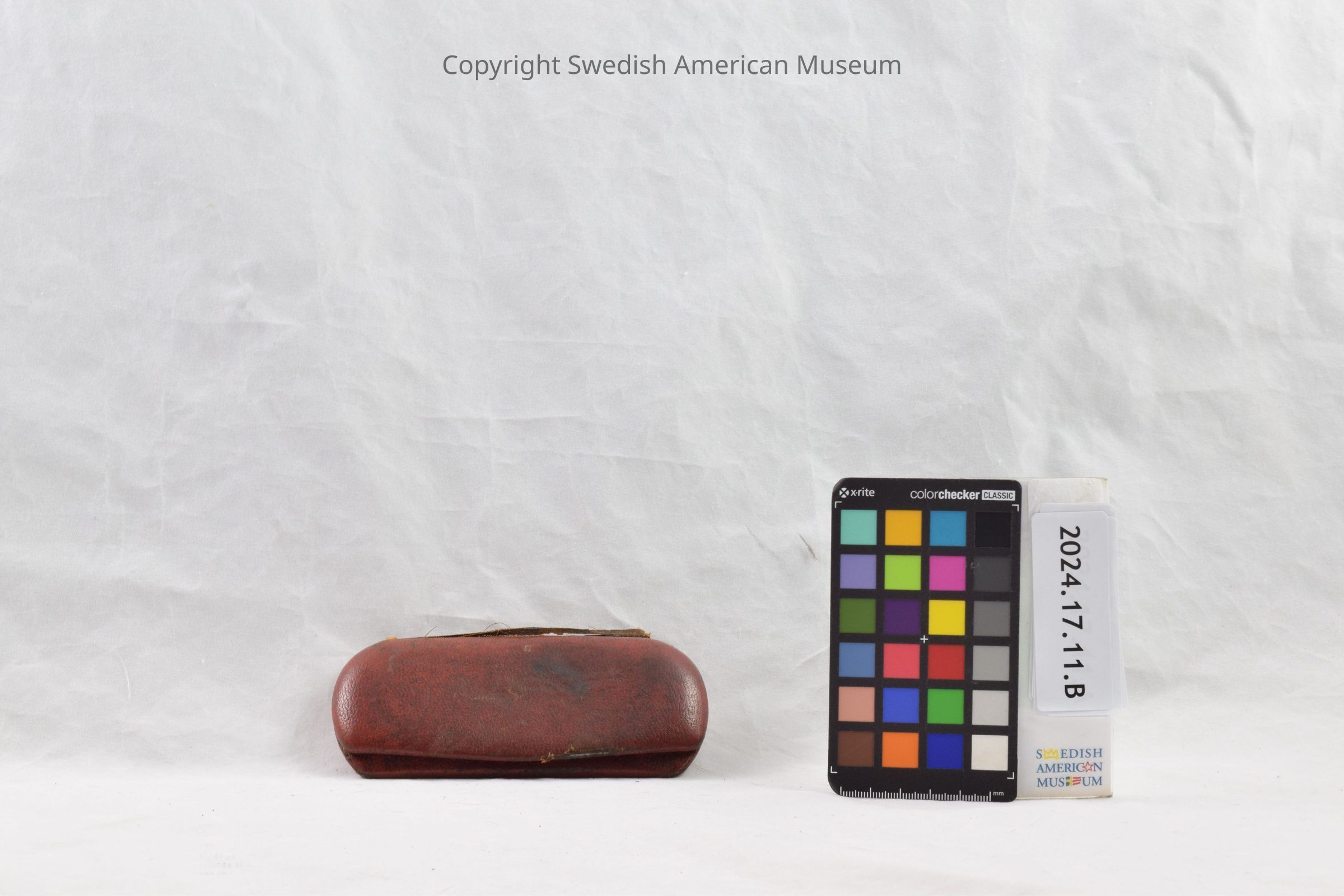 Brownish-red leather eyeglasses case with black cloth lining. Snaps closed without a fastener.Context