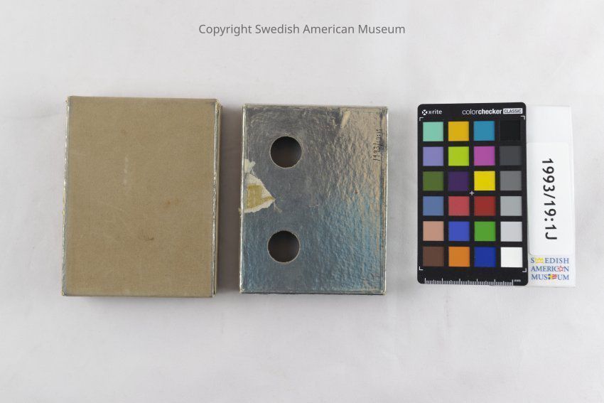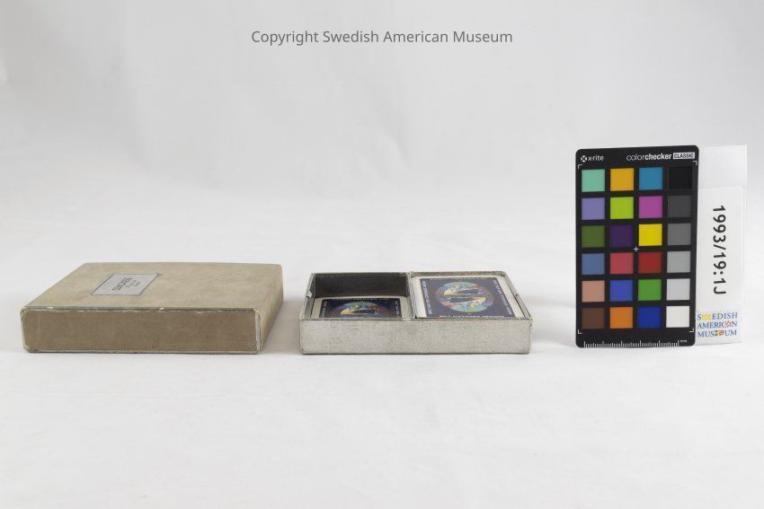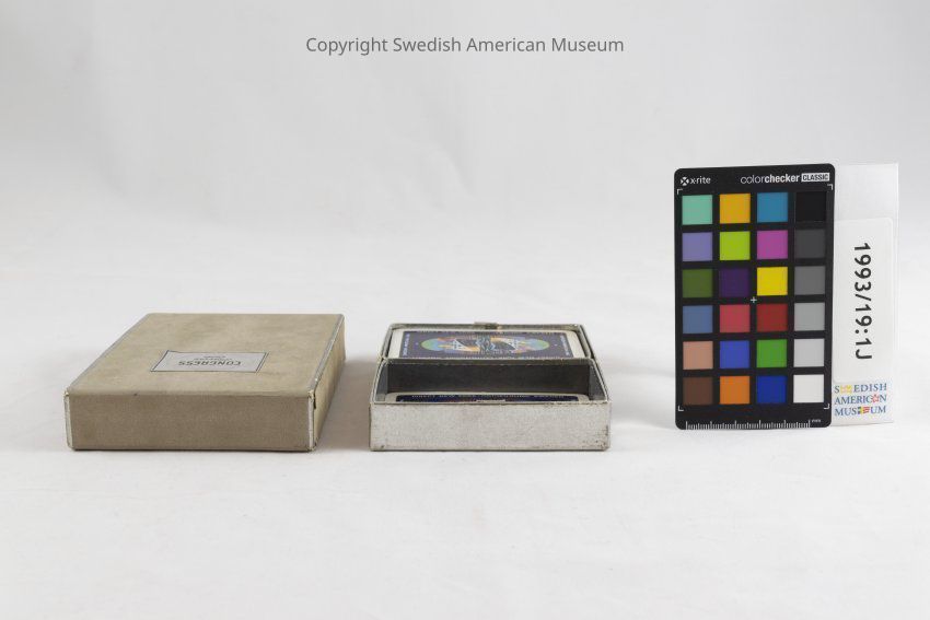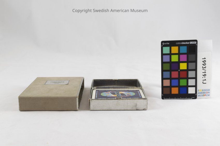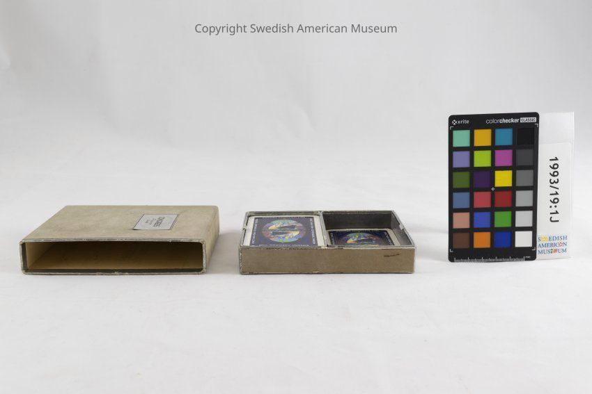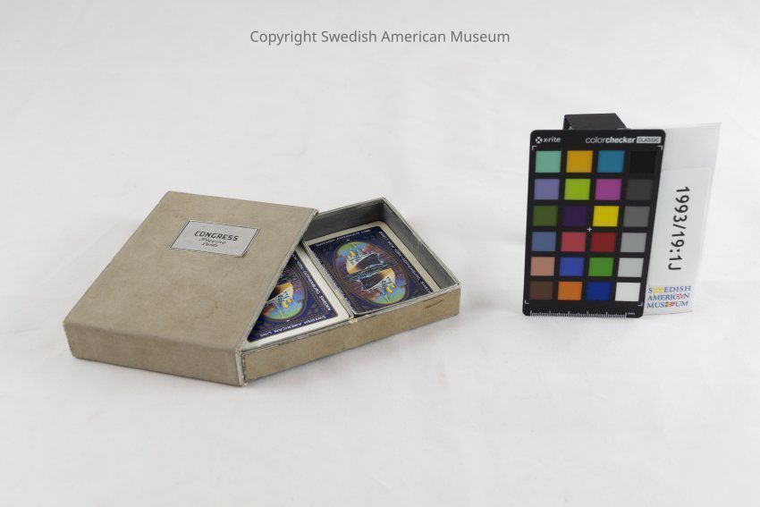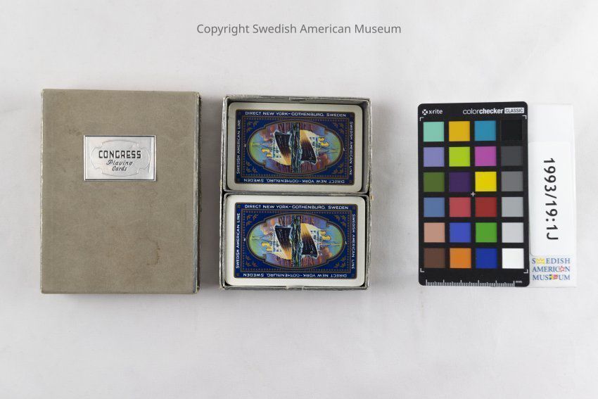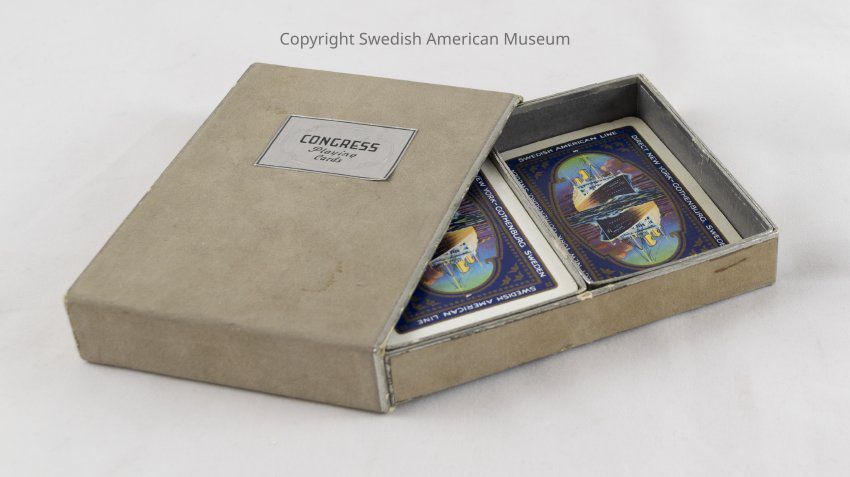 Card deck of fifty-two playing cards with a picture of the Swedish American Line "Gripsholm" ship in color. The text "Swedish American Line Direct New York - Gothenburg, Sweden" is written around the perimeter of each card. Accompanying box with matching design.Context