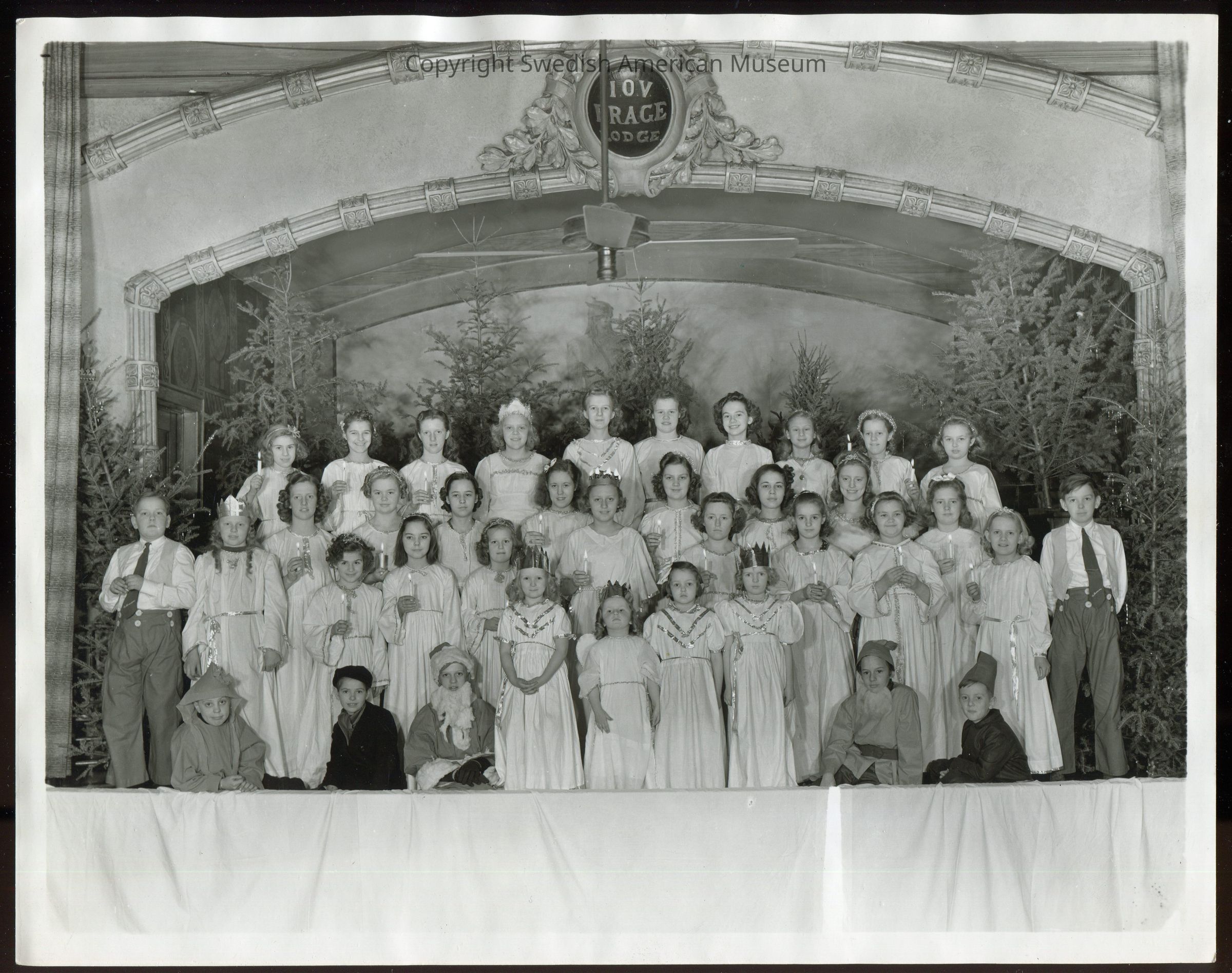 Black-and-white photograph of a Lucia performance by the Vårblomman Children's Club.