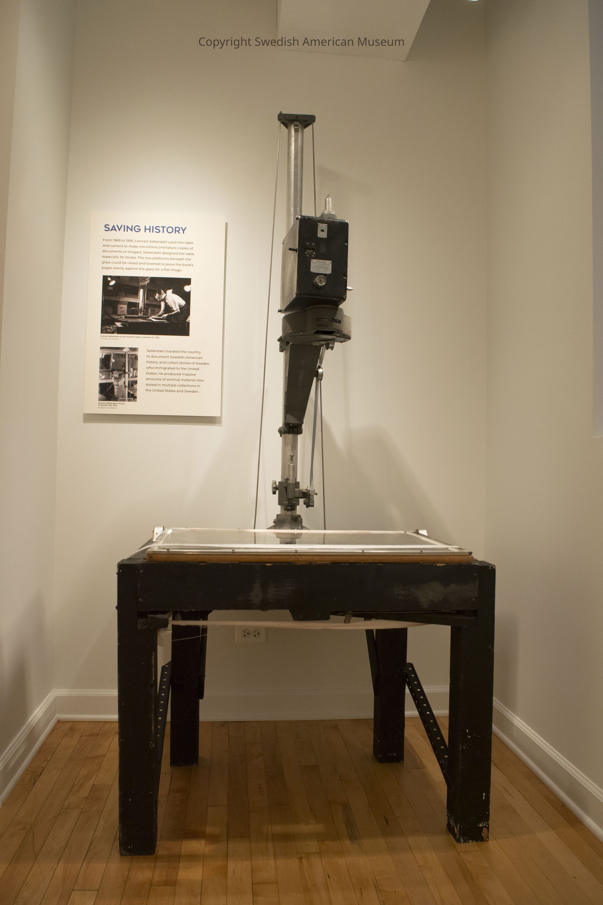 Lennart used this table and camera (2000.89.1.B) to microfilm millions of pages. This table was specialized for books. The two platforms beneath the glass could be raised and lowered to press the book's pages evenly against the glass for a flat image. The glass made lighting tricky, so Lennart often filmed in dark spaces where he could control the light.Acquisition