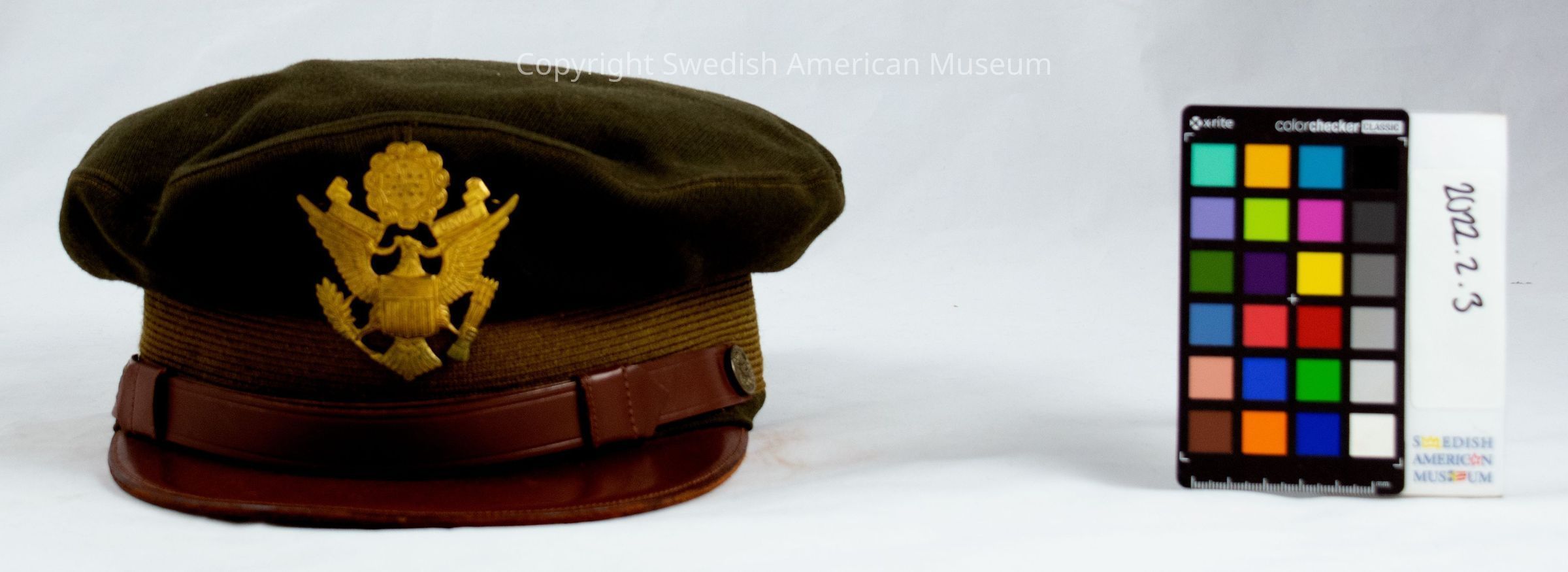 Hat in drab olive color with a brown lip, chin strap, and rim. There is a brass emblem on the front of an eagle holding arrows and an olive branch. The emblem reads "E Pluribus Unum", Latin for "one out of many", which is a traditional motto of the United States.