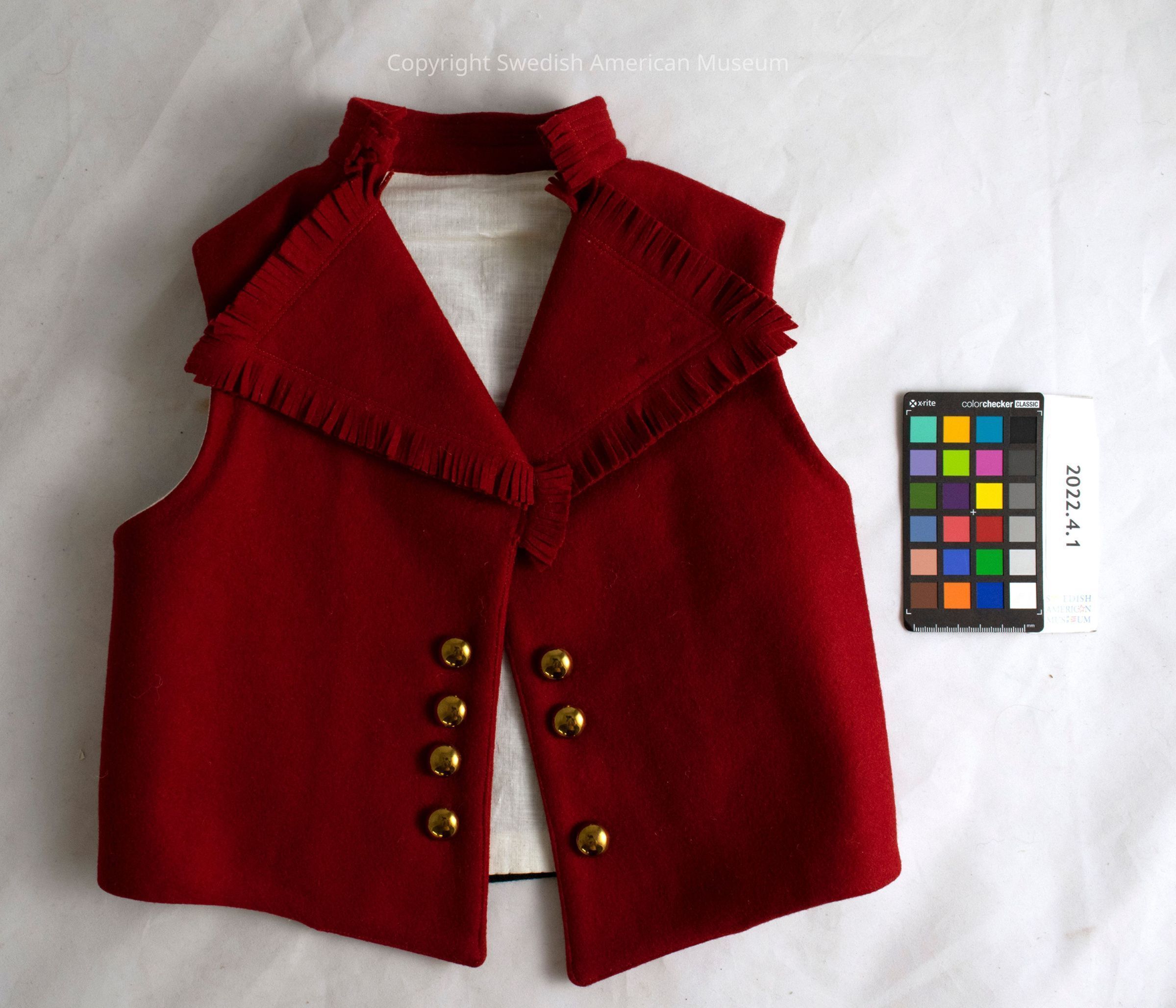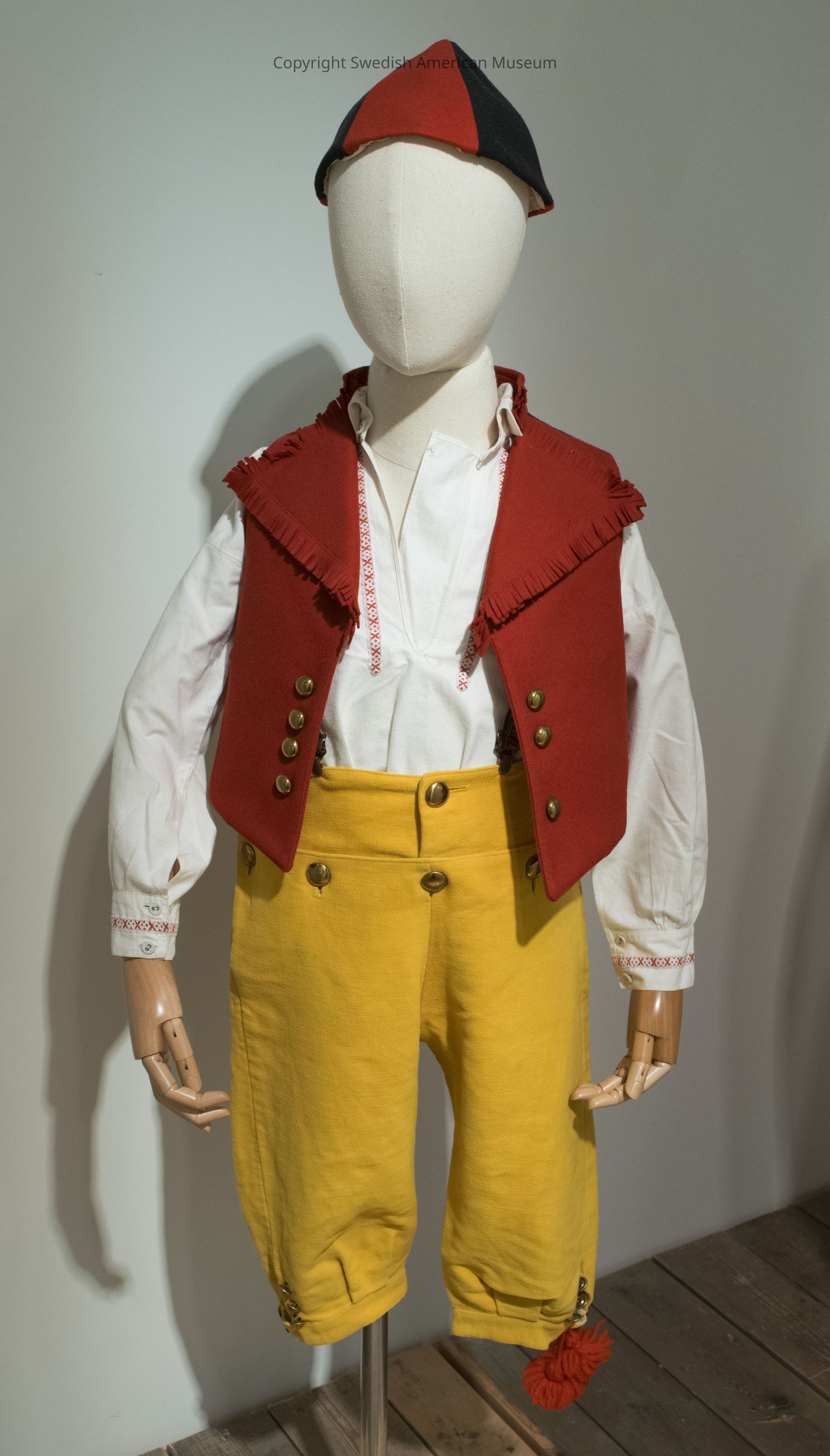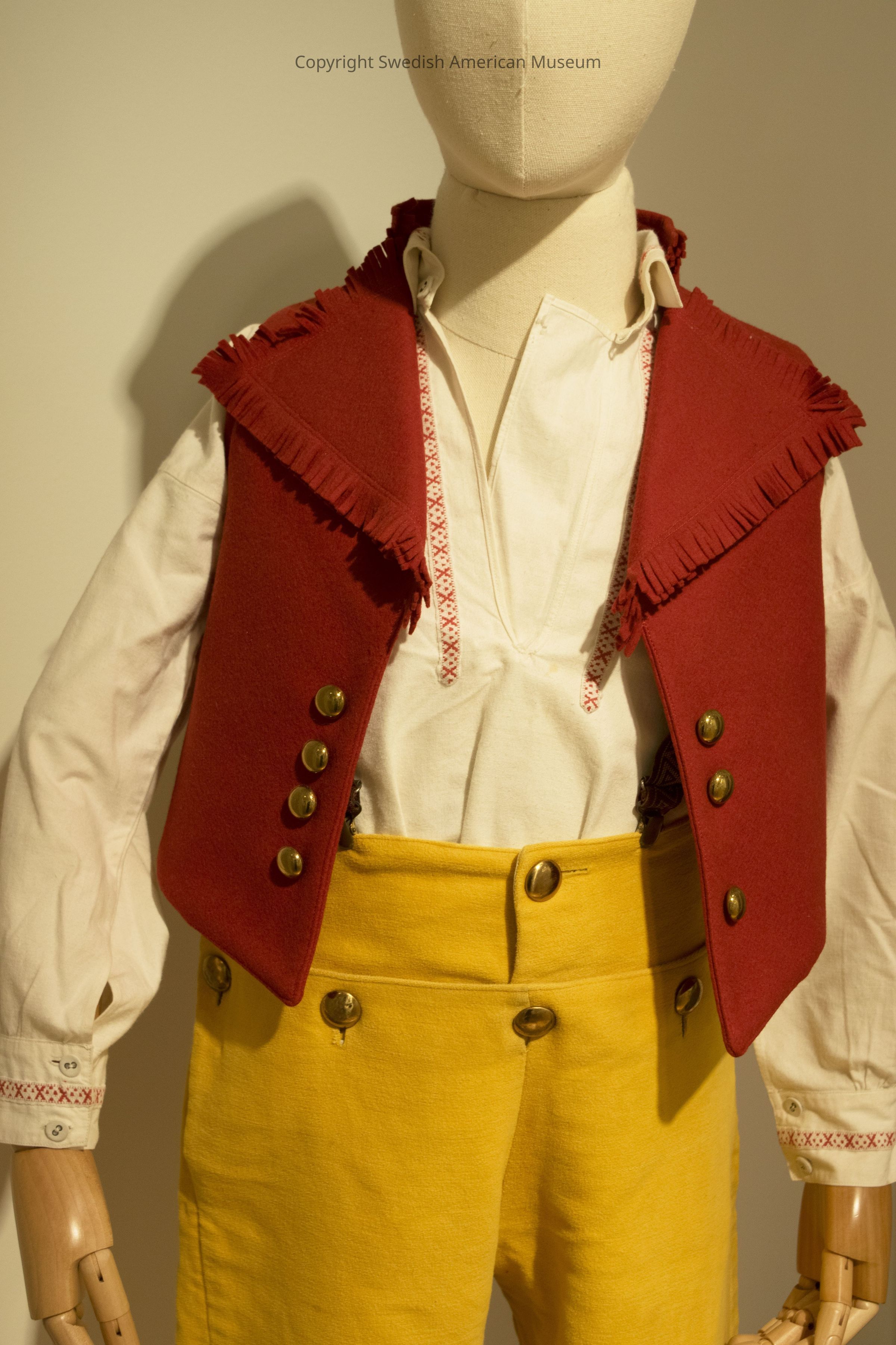 Child's red vest, part of a boy's Swedish folk costume representing Leksand in the province of Dalarna. The vest has 7 gold painted buttons (one is missing on the right-hand side), and fringe lining the collar. The inside is lined with linen. The outside is wool, the back panel is black.Context