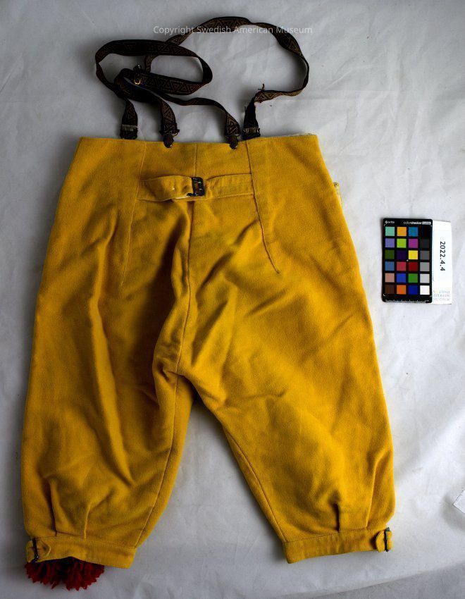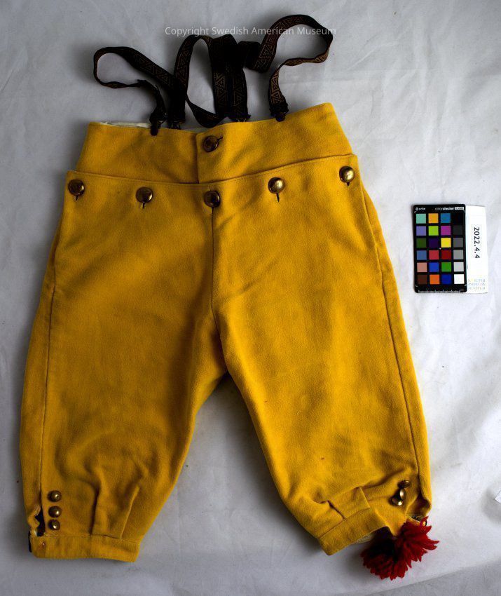 Breeches part of a boy's Swedish folk costume representing Leksand in the province of Dalarna. The pants (2022.4.4.A) are yellow with gold painted buttons and red tassles at the ankle. Only the right leg has the tassles left. At the back is a metal clasp to adjust the waist size of the pants. There are holes for pockets, but no pocket lining, it just goes to the inside of the pants. The waist and bottom of the pants are lined with linen.
