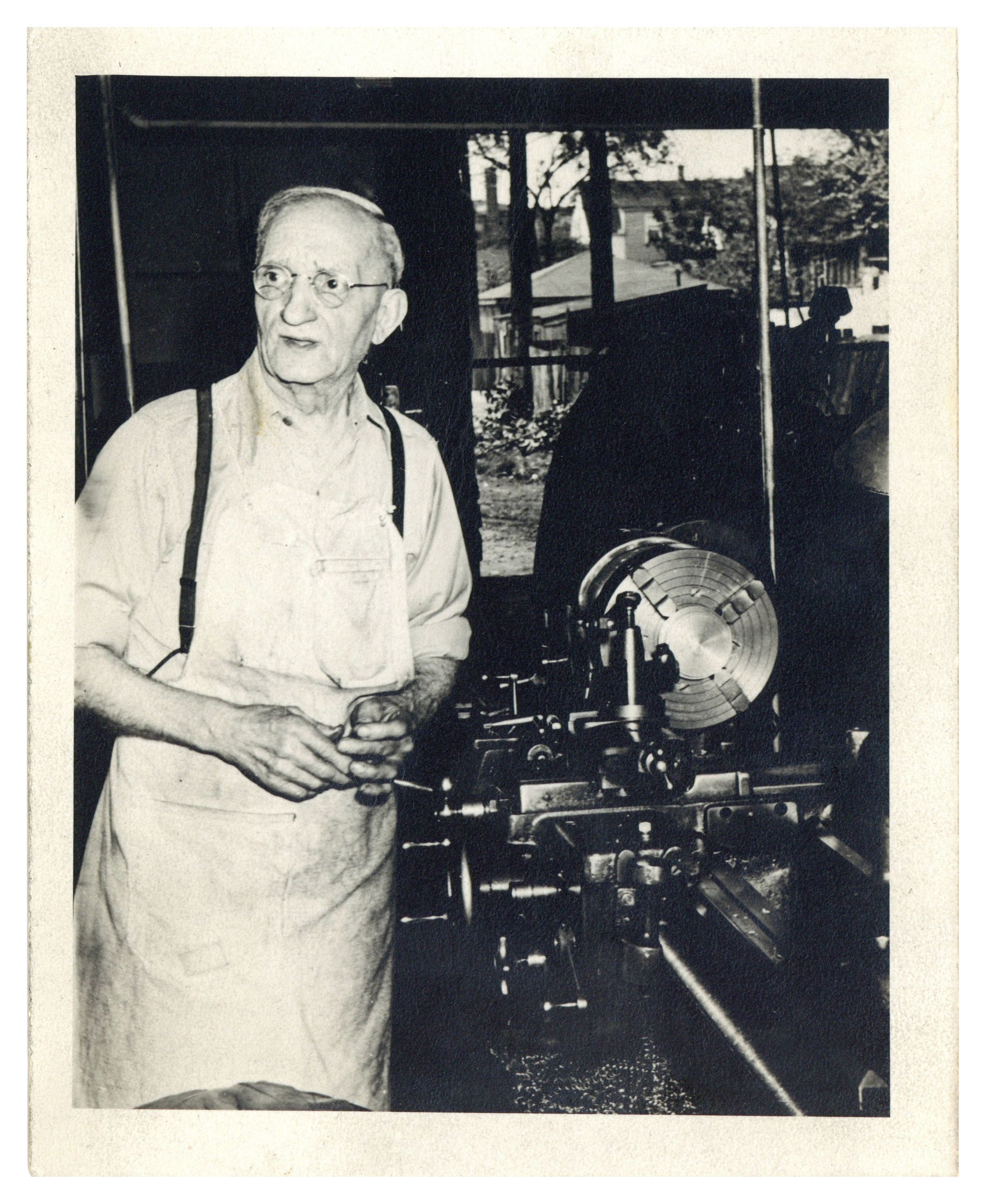 Black-and-white photograph of John Theodore Carlson (possibly) at some machinery. He is wearing a light-colored work apron over his shirt, which has the sleeves rolled up.Title