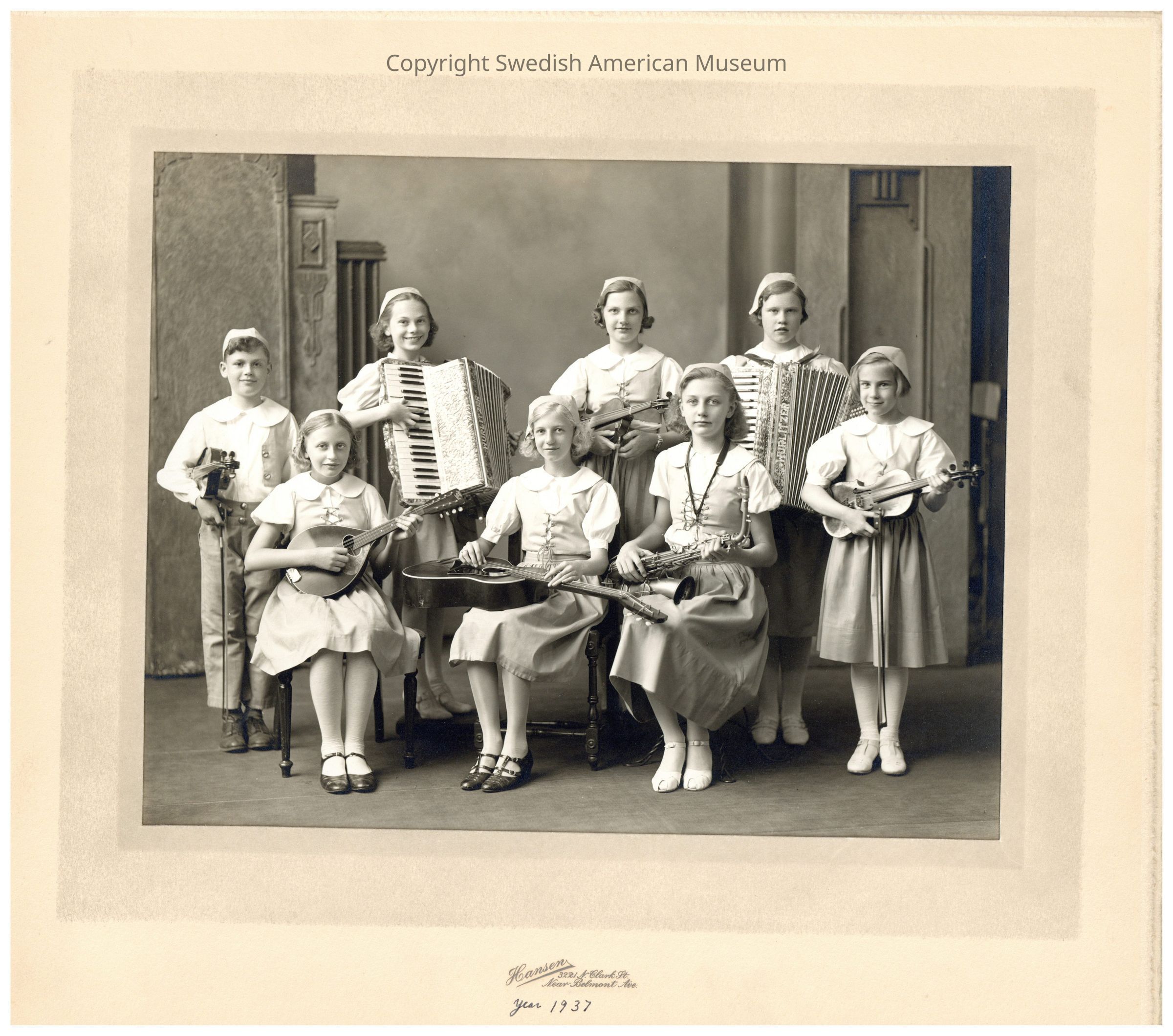 Black-and-white photograph of the Vårblomman's Children's Club. The photograph shows eight children dressed in Swedish folk costumes. The children are posing with various musical instruments. The photograph was taken in 1937. Ruth I. Pearson was a charter member, and she is on the right holding the violin.Photograph Details