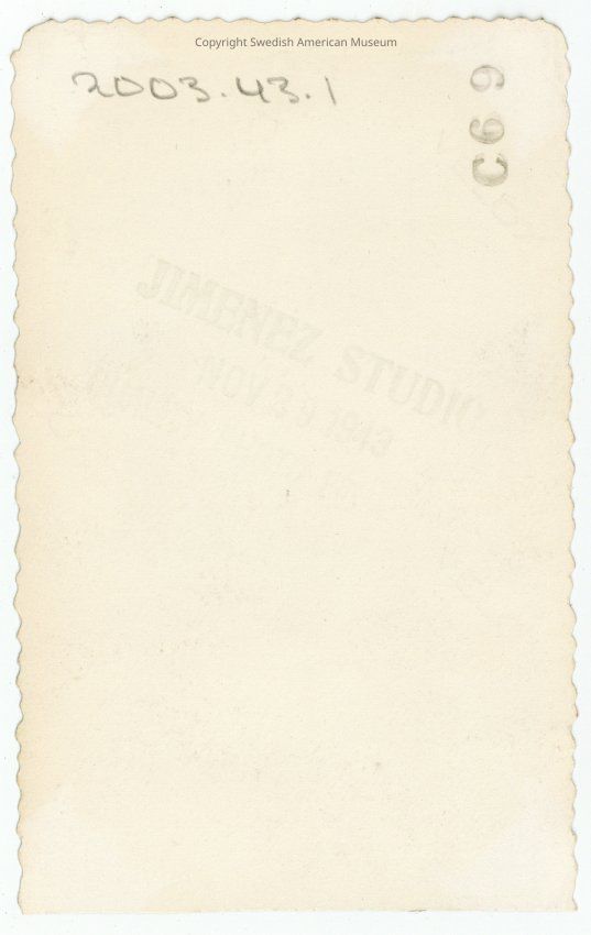 Donated by Eunice Swanberg, daughter of Hulda Johnson and Julius Swanberg. Hulda Johnson was born in Sweden and immigrated to Chicago, Illinois. Her first job in Chicago was as head cook and bottle washer on Orleans Street. She later worked at Peterson's Nursery, where she started dating Julius Swanberg. Julius was born in Stockholm in 1887 and migrated to the U.S. at age 15. Julius was a prolific inventor and mechanical engineer, who went on to patent a mechanical pencil. Hulda and Julius married on May 7, 1910. Their daughter Eunice was born on August 11, 1911, at Augustana Hospital in Chicago. The couple's first home was on Wayne Avenue.Acquisition