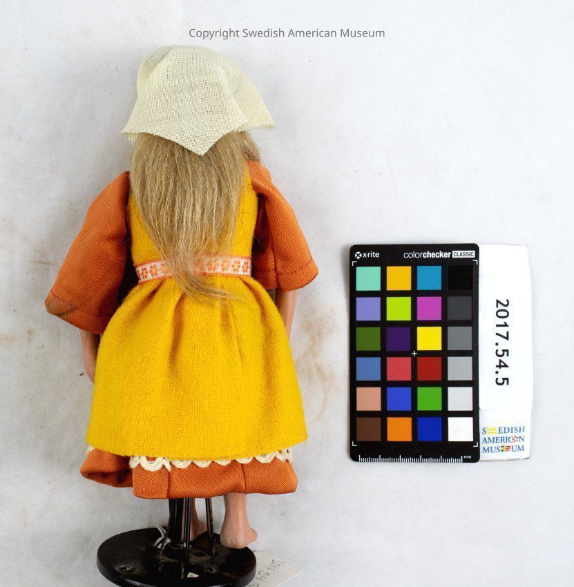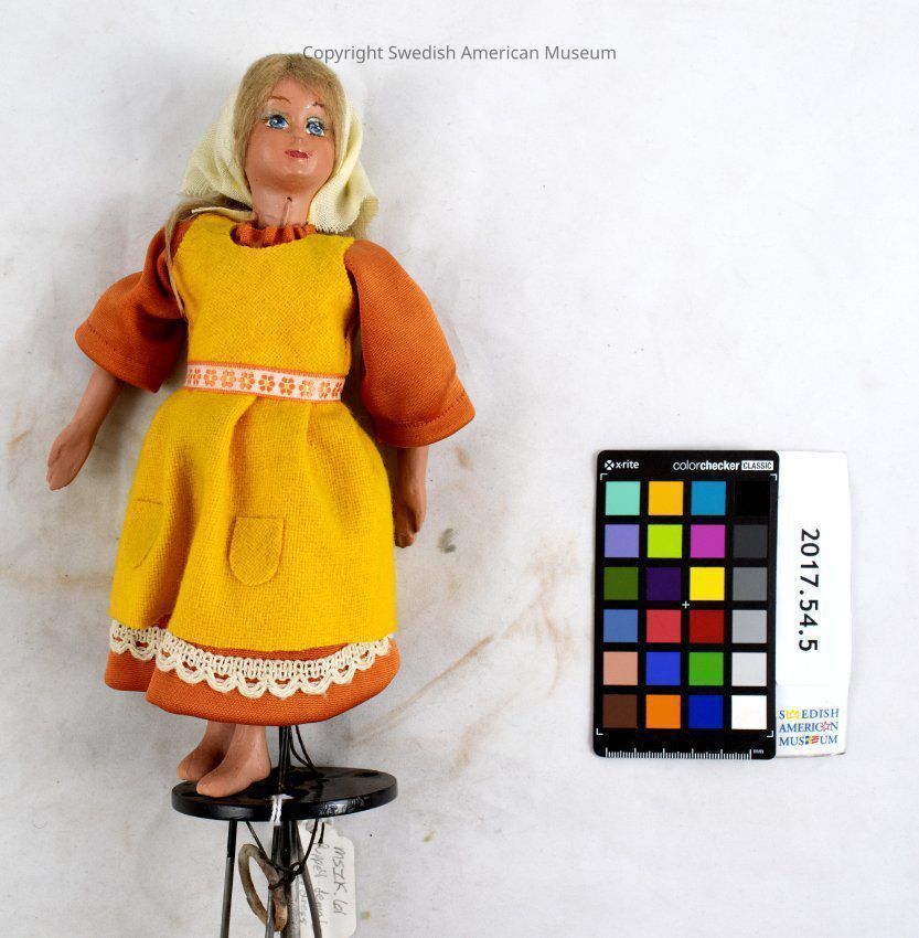 Kungsholm Miniature Grand Opera puppet. Female puppet wearing an orange dress with yellow apron, white kerchief, and blonde hair.Context
