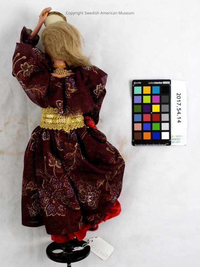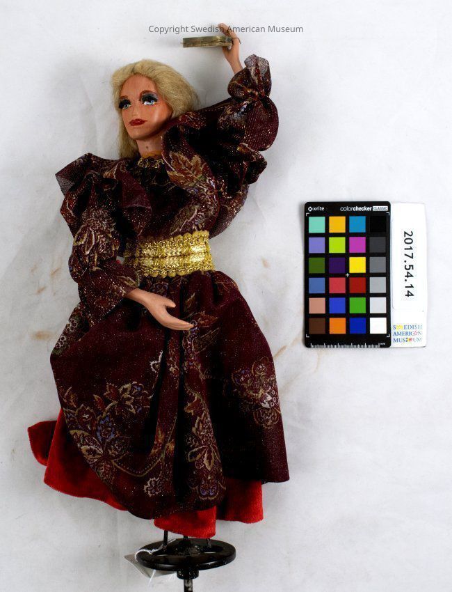 Kungsholm Miniature Grand Opera puppet. Female puppet with long blonde hair wearing a maroon dress with gold floral print, and a gold belt. One of four tambourine players.Context