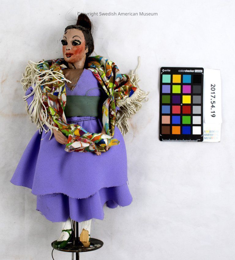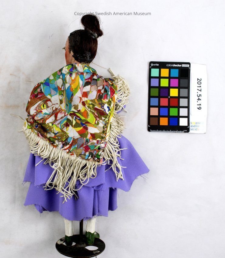 Kungsholm Miniature Grand Opera puppet. Female, brown hair in bun, purple dress with a green sash, and multi-colored fringed shawl. The left foot is broken.Context