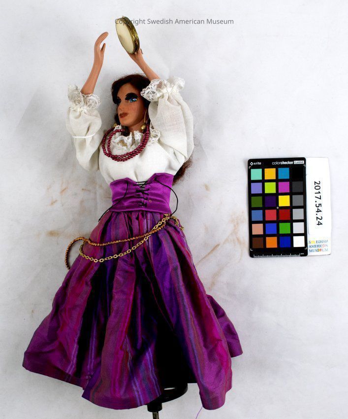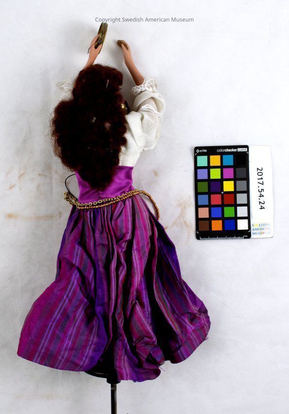 Kungsholm Miniature Grand Opera puppet. Female with long red hair, white blouse, fuchsia corset, fuchsia and purple striped skirt. One of four tambourine players.Context