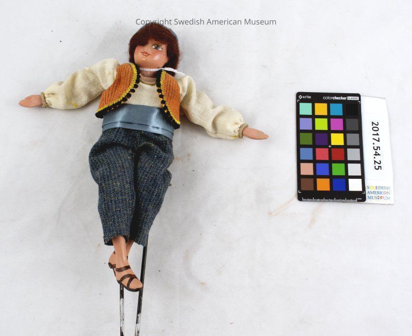 Kungsholm Miniature Grand Opera puppet. Male puppet with brown hair, blue cap, orange striped vest, sandals, blue sash belt, and blue pants.Context